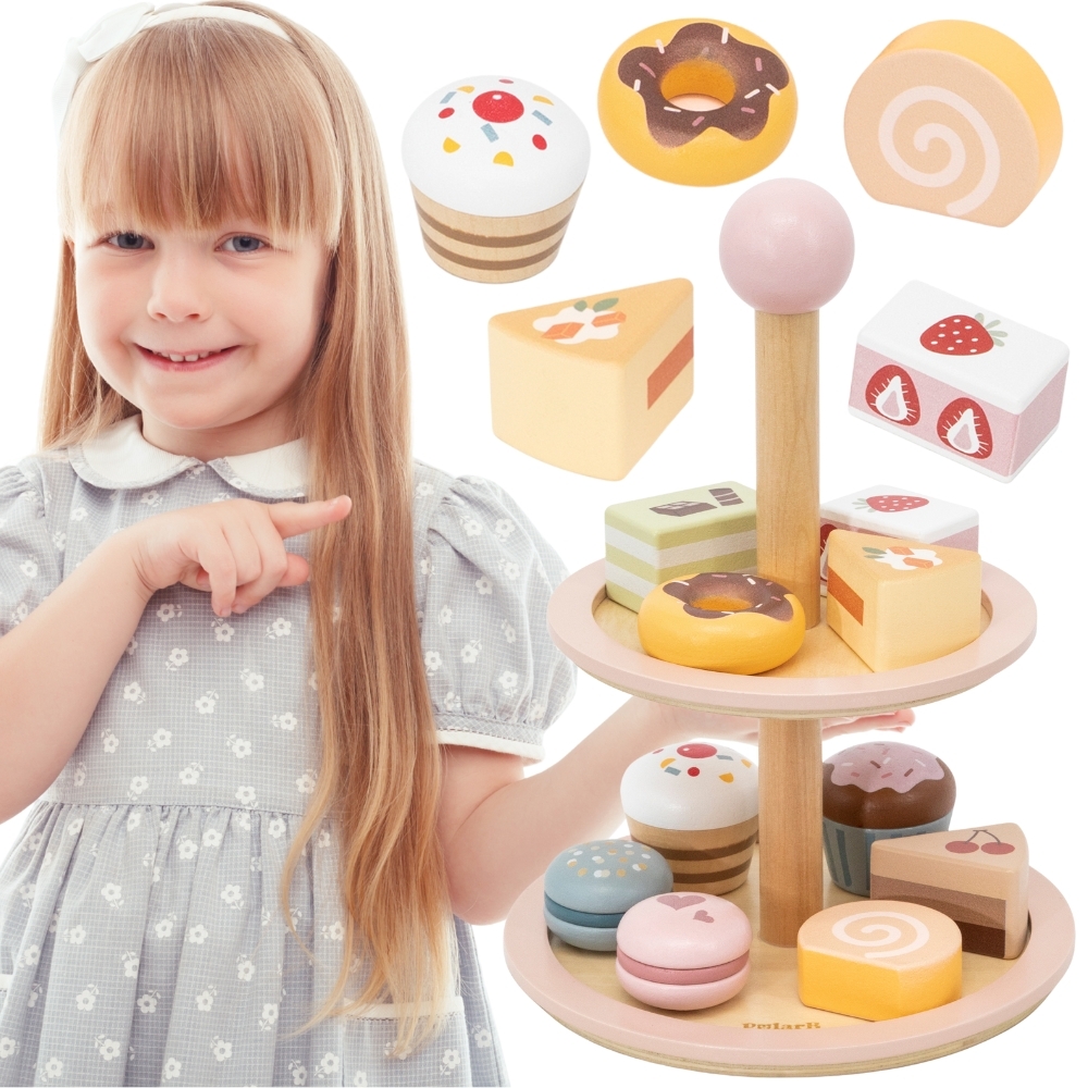Etažérka aj všetky sladkosti sú vyrobené z kvalitného dreva s dokonale hladkými hranami a natreté netoxickými farbami v jemných pastelových odtieňoch série PolarB. Ideálna veľkosť zákuskov je prispôsobená malým detským rúčkam, takže manipulácia s nimi je jednoduchá a zábavná.