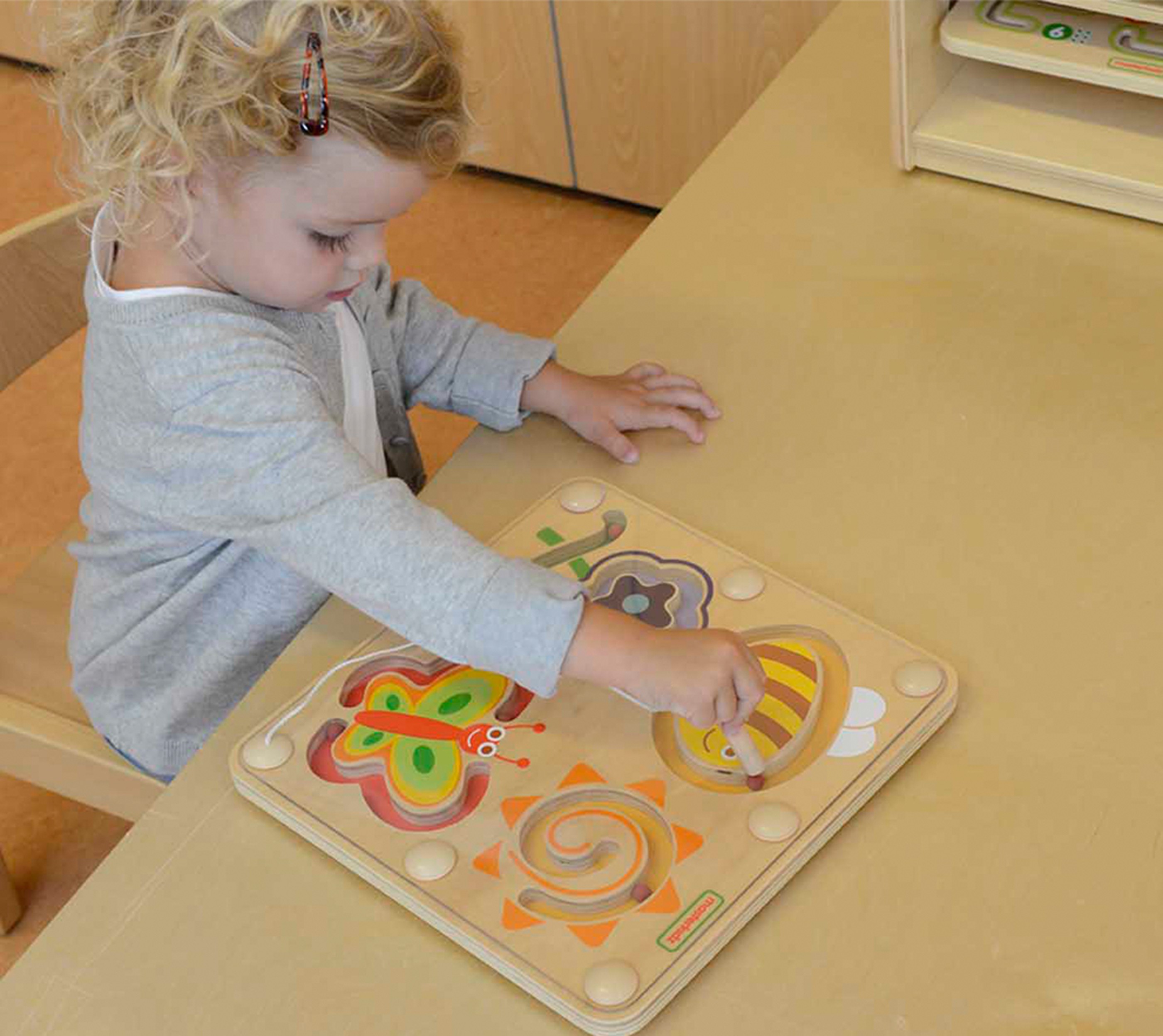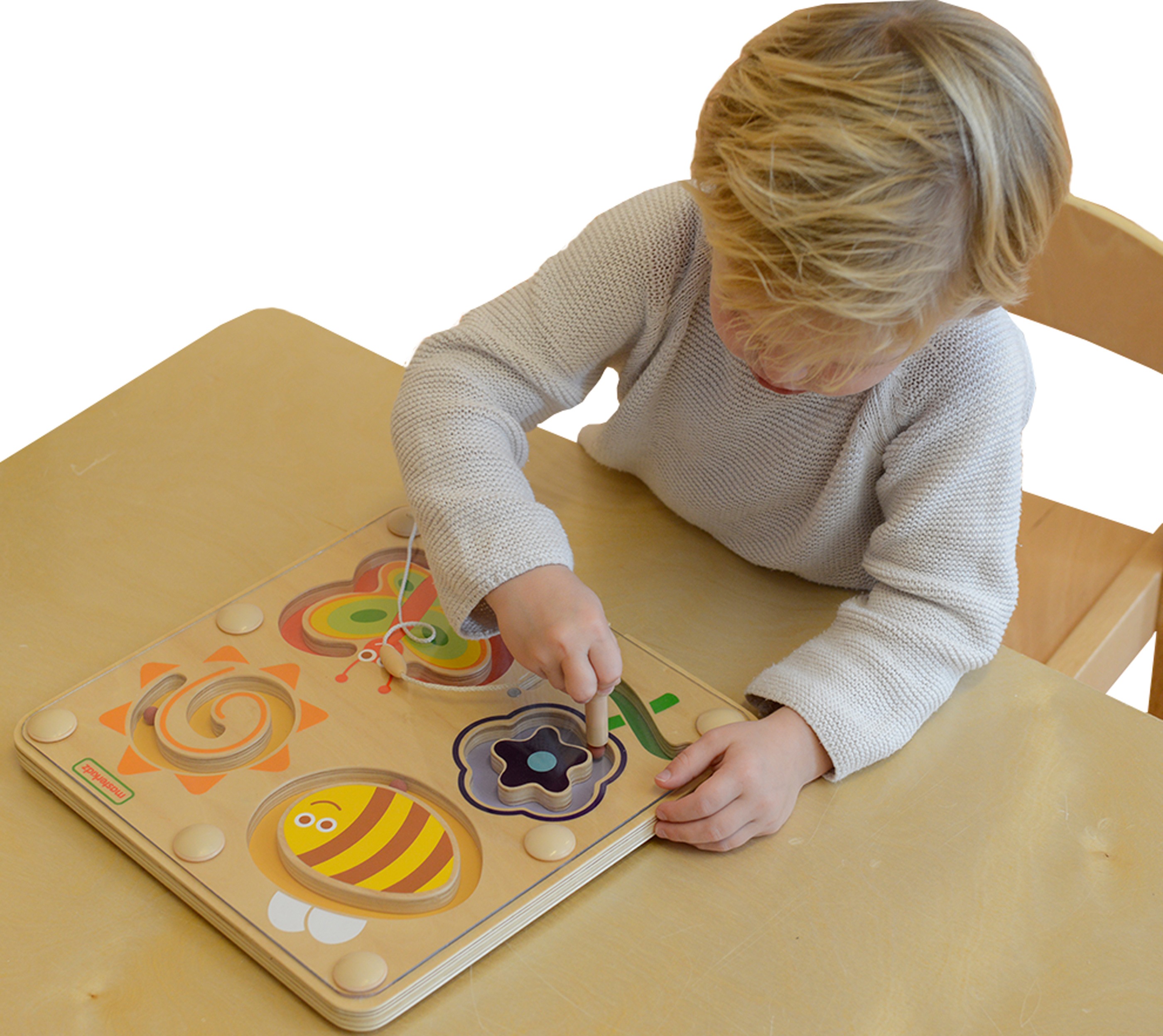 Zoznámte svoje deti s veselou včielkou, kvetinkou, slniečkom a motýlikom prostredníctvom tejto nádhernej, drevenej senzorickej hračky. Magnetický labyrint Masterkidz je navrhnutý tak, aby každé dieťa premenil na trpezlivého objaviteľa. Úlohou dieťaťa je pomocou priloženého magnetického pera chytiť farebnú guličku a previesť ju spletitými cestičkami labyrintu k správnemu zvieratku či kvetu.