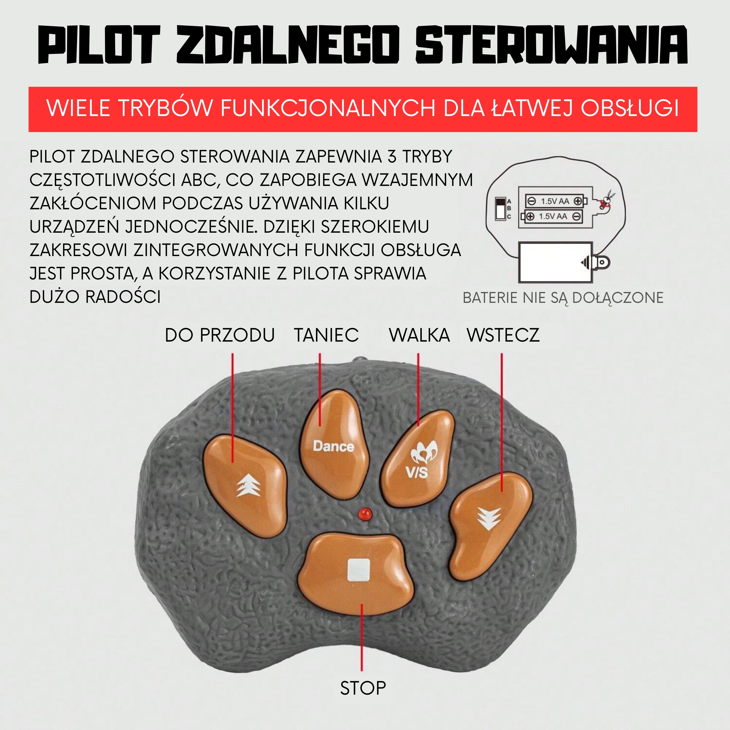 - Dinosaurus a diaľkové ovládanie vyžadujú na prevádzku 5 x 1,5V AA batérií (nie sú súčasťou balenia).