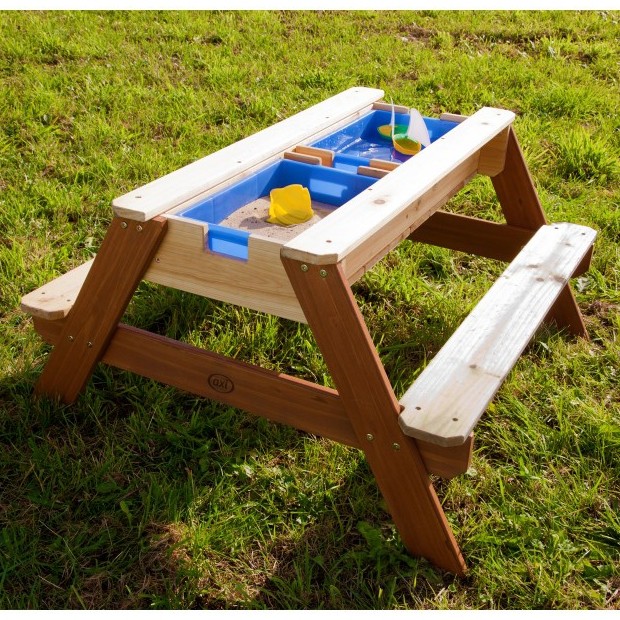 Detský záhradný stôl Nick od renomovanej spoločnosti AXI je multifunkčný stolík, ktorý má pod odnímateľnou doskou tajný priestor s dvoma modrými nádobami. Tieto modré nádoby môžu byť naplnené pieskom alebo vodou, ale sa do nich dajú uložiť aj hračky. Kontajnery sú navyše odnímateľné, čo uľahčuje ich čistenie.