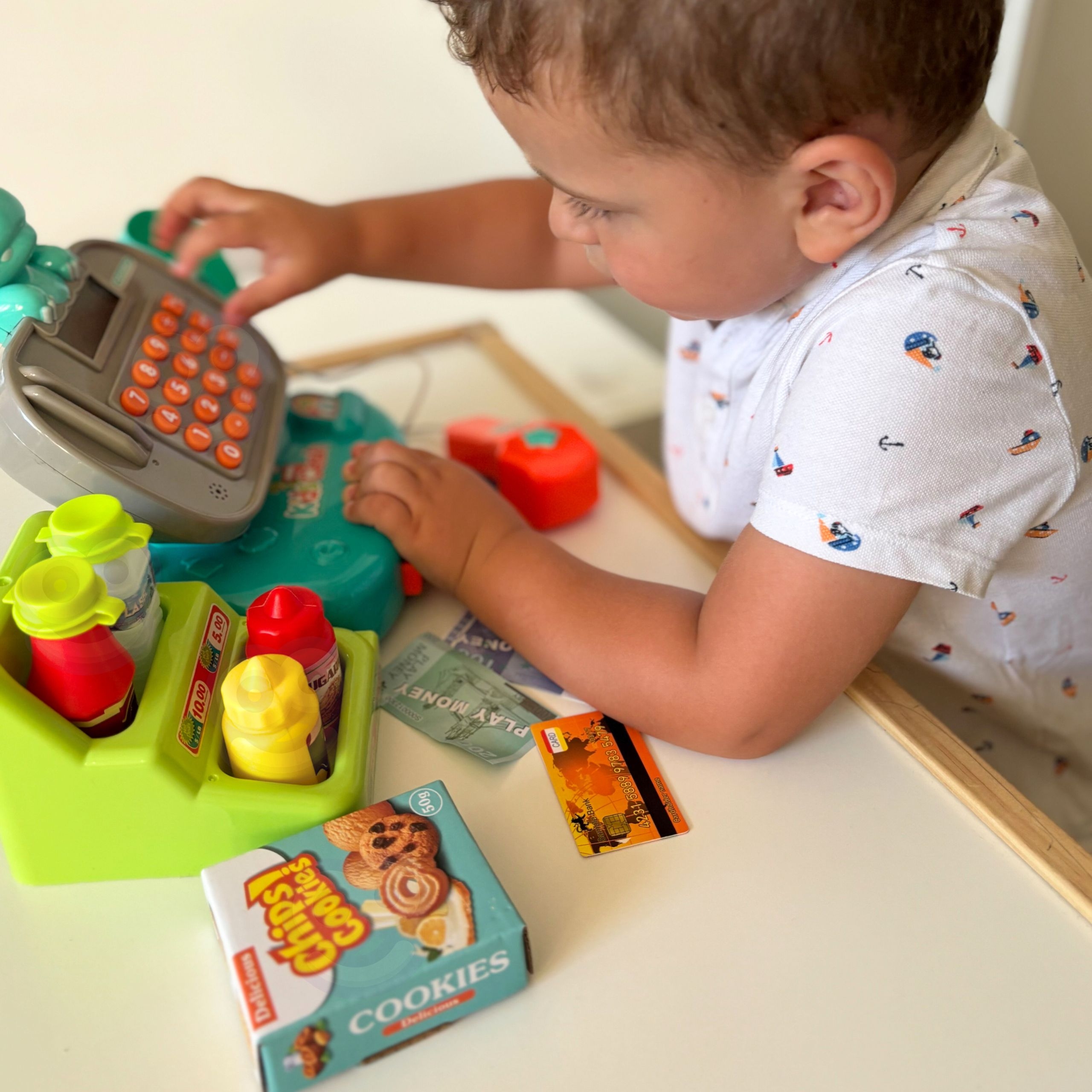 Obchodná Dino poklaldnica s policou od spoločnosti WOOPIE. Deti si môžu vybrať produkty, ktoré si chcú kúpiť a následne ich zaplatiť pri pokladni. Použijú čítačku na skenovanie čiarových kódov a iných produktov. Potom môže kupujúci platiť peniazmi alebo platobnou kartou.