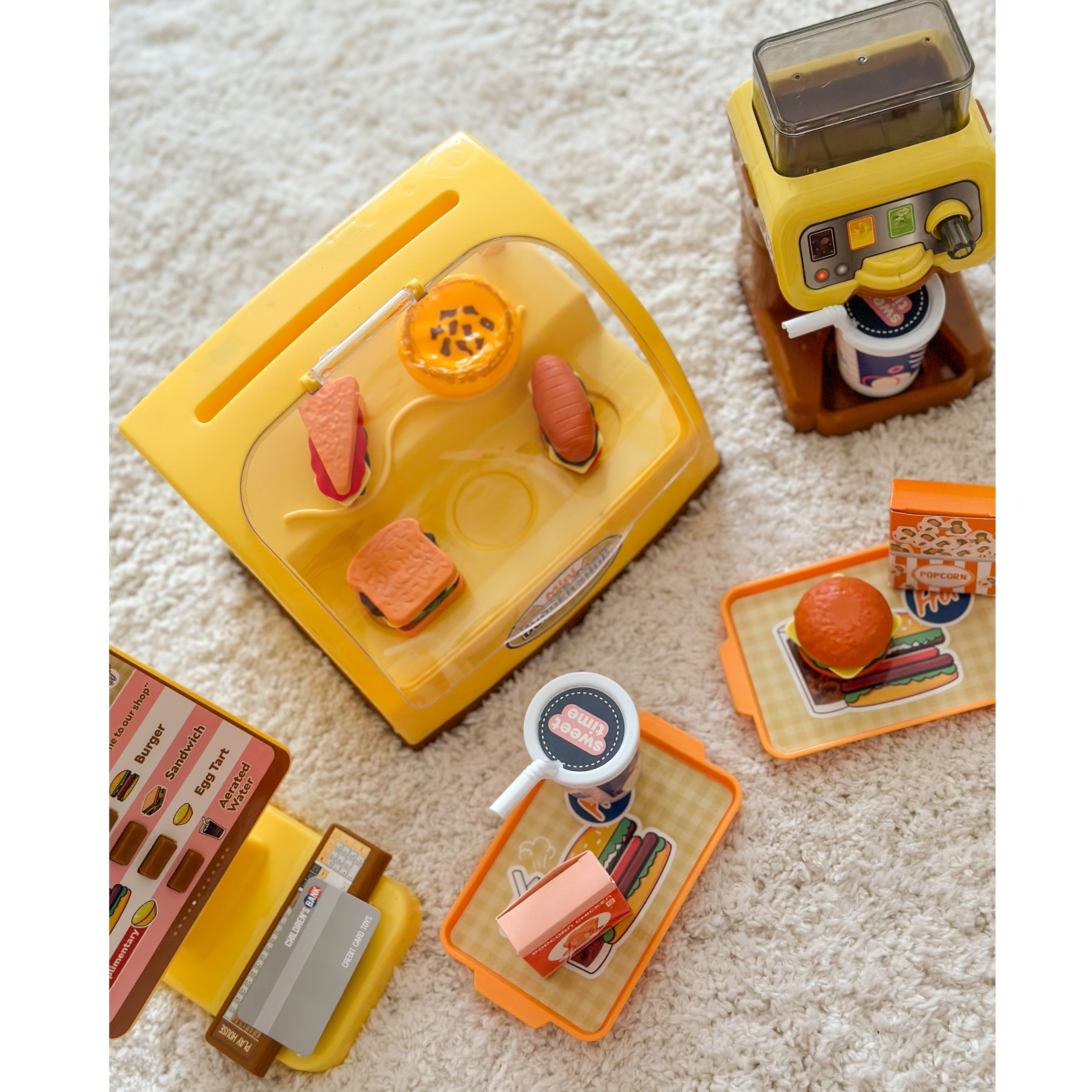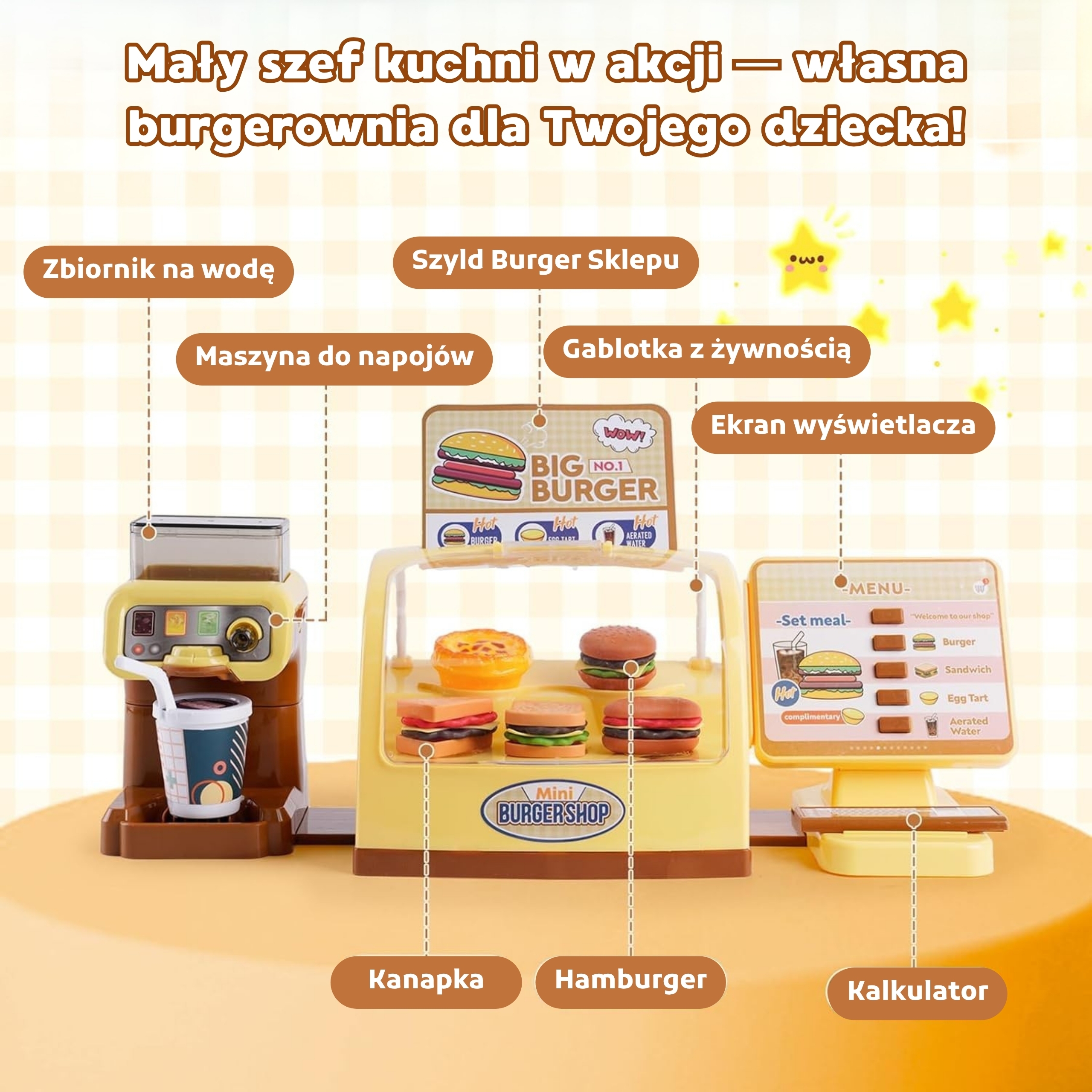Burger Shop "BIG BURGER" od spoločnosti WOOPIE je skvelá hracia súprava. Dokážeme obslúžiť zákazníkov, ktorí si vyberajú riad priamo z osvetleného pultu! Má obrazovku s tlačidlami, po stlačení nám obchod ponúka zvukové efekty! Do dávkovača môžeme naliať vodu a následne ju preliať do pohárika so slamkou. Sada rozvíja manuálne zručnosti, predstavivosť, kreativitu a samostatné myslenie.