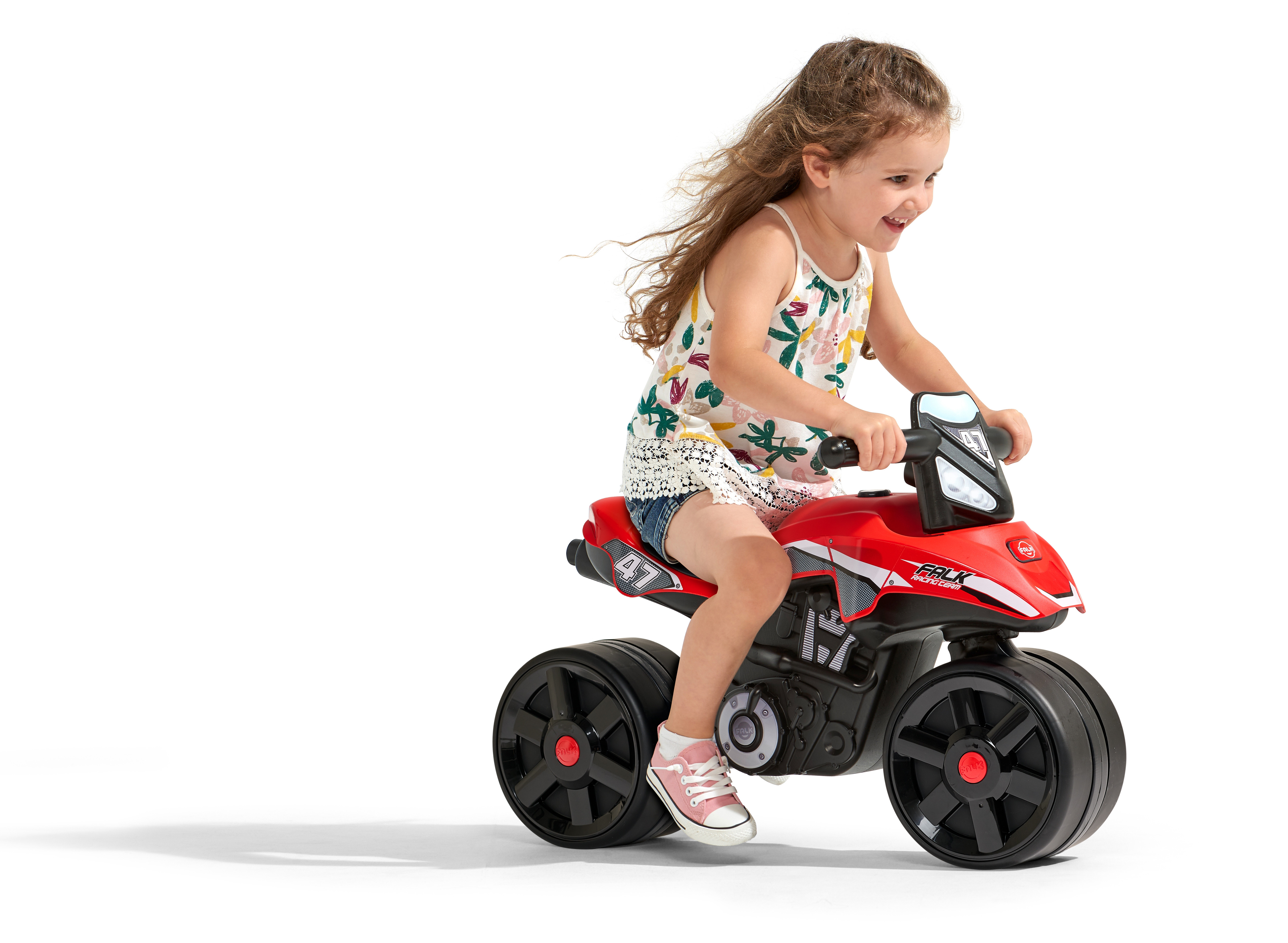 Športová motorka od francúzskej spoločnosti Falk je ideálnym darčekom pre deti od 1 roka. Krásna grafika a veľmi realistický vzhľad prinesú malým deťom veľa radosti. Vozidlo je vybavené veľkými kolesami, ktoré sú ideálne na použitie na rôznych povrchoch. Predné koleso je otočné pre pohodlnejšiu jazdu a otáčanie.