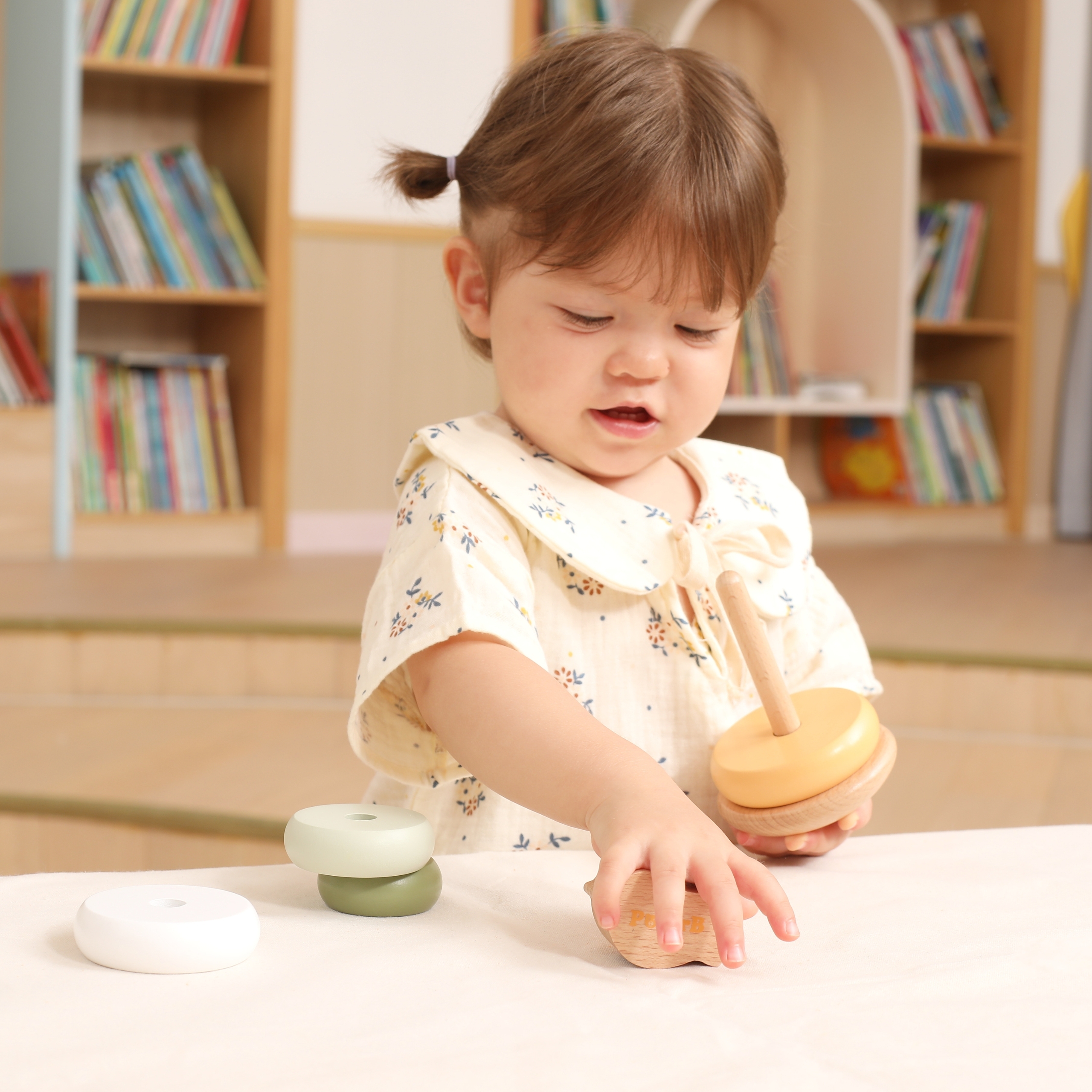 🧠 Základný tréning logiky a motoriky: Skladanie krúžkov od najväčšieho po najmenší je jednou z prvých logických úloh a skvelým tréningom pre detské pršteky.