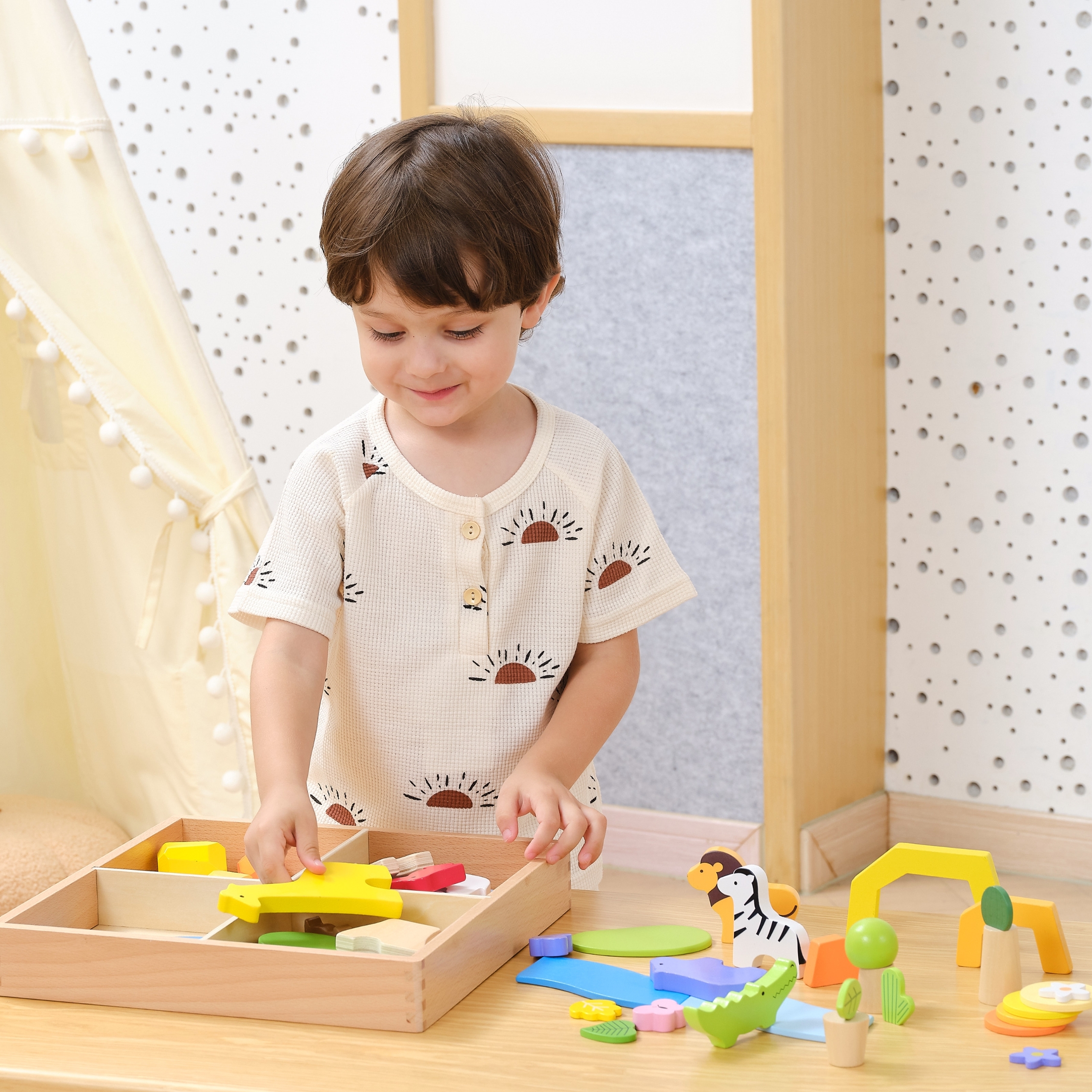 Sada obsahuje nádherné figúrky divokých zvierat (slon, žirafa, lev, zebra, krokodíl, plameniak) a množstvo prvkov tropickej prírody (stromy, kvety, rieka). Deti si z nich môžu postaviť vlastnú safari scénu, triediť ich, počítať alebo ich použiť ako postavičky vo svojich dobrodružných príbehoch. Všetky dieliky sú vyrobené z kvalitného dreva, natreté netoxickými farbami a uložené v praktickom drevenom boxe s priehradkami.