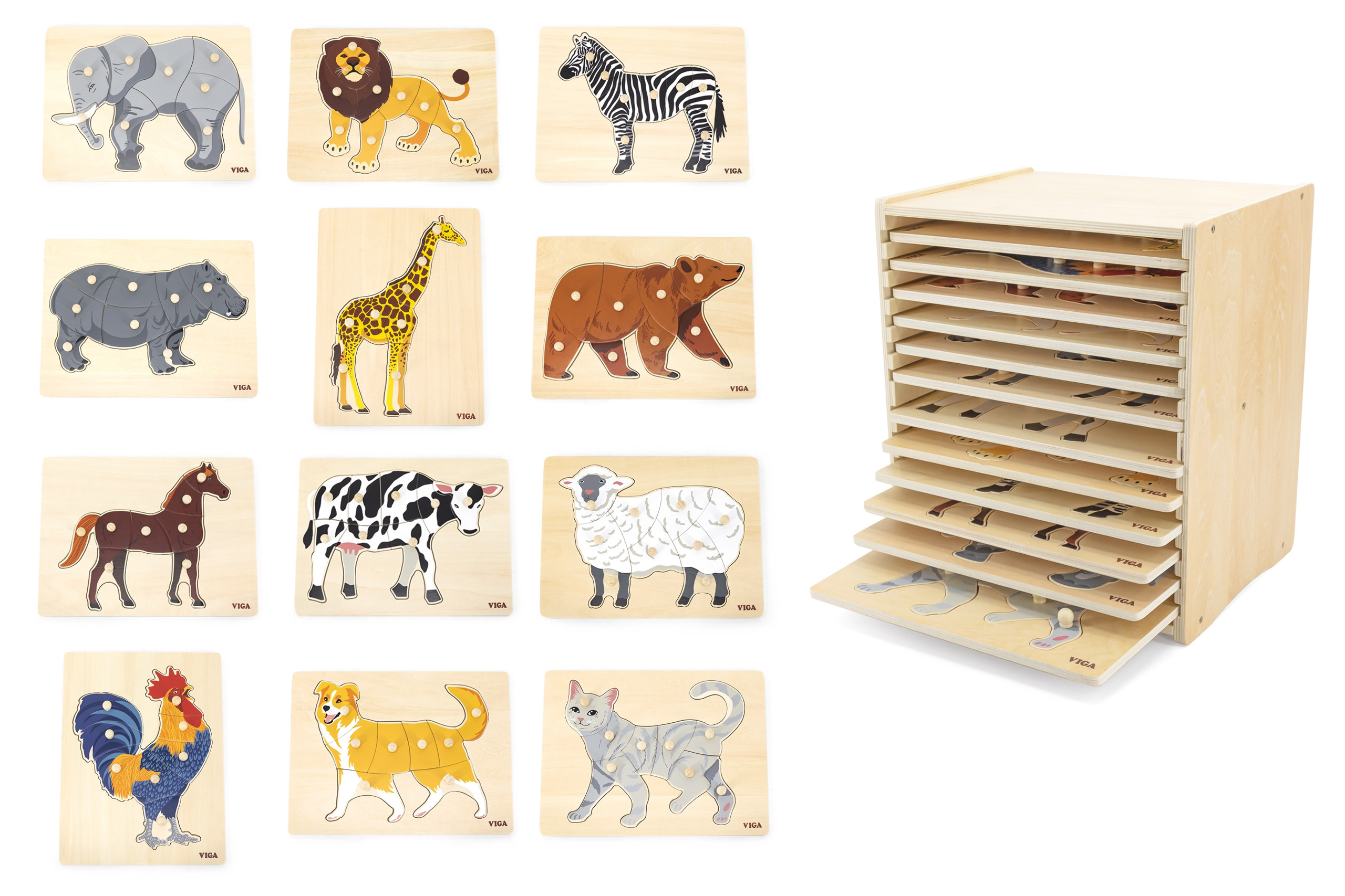 Sada 12 drevených puzzle - zvieratká so stojanom od spoločnosti VIGA je edukačná hračka, ktorá poteší každé dieťa. 12 drevených tabúľ zobrazujúcich fascinujúce zvieratá z rôznych kútov sveta. Úlohou dieťaťa je priradiť farebné dieliky puzzle k príslušným obrysom na tabuli. Jednoduché tvary, pekné obrázky a farby urobia hru nielen príjemnou, ale aj užitočnou. Drevené puzzle v ráme od Viga sú perfektným darčekom pre každého malého prieskumníka!