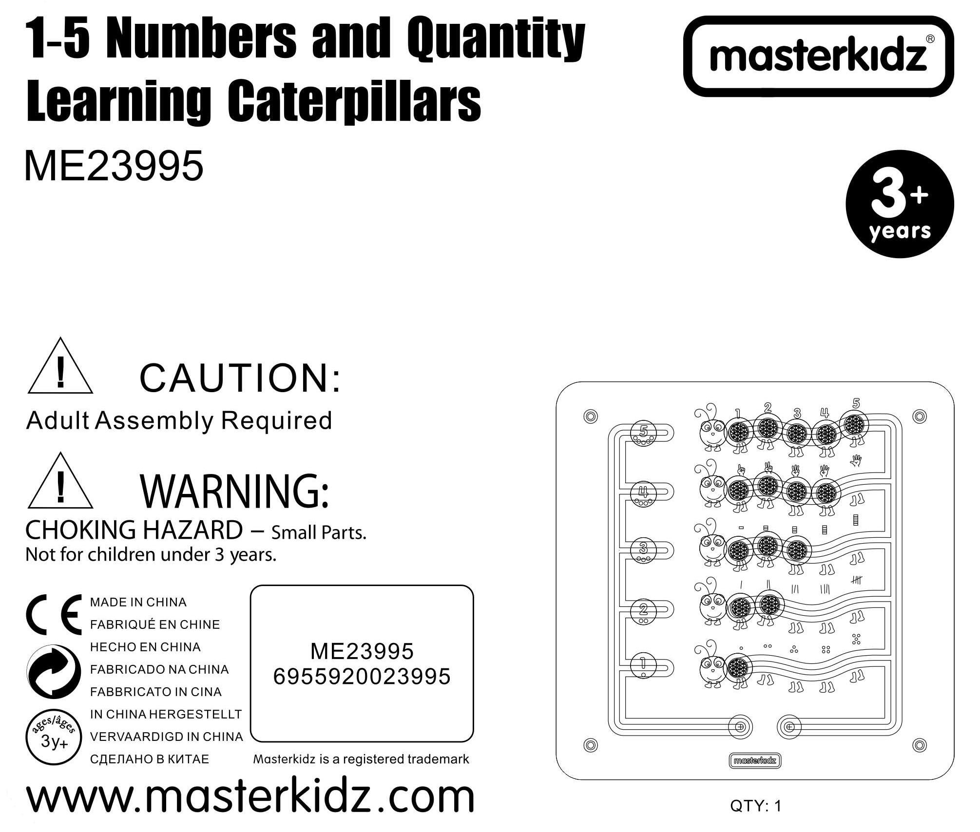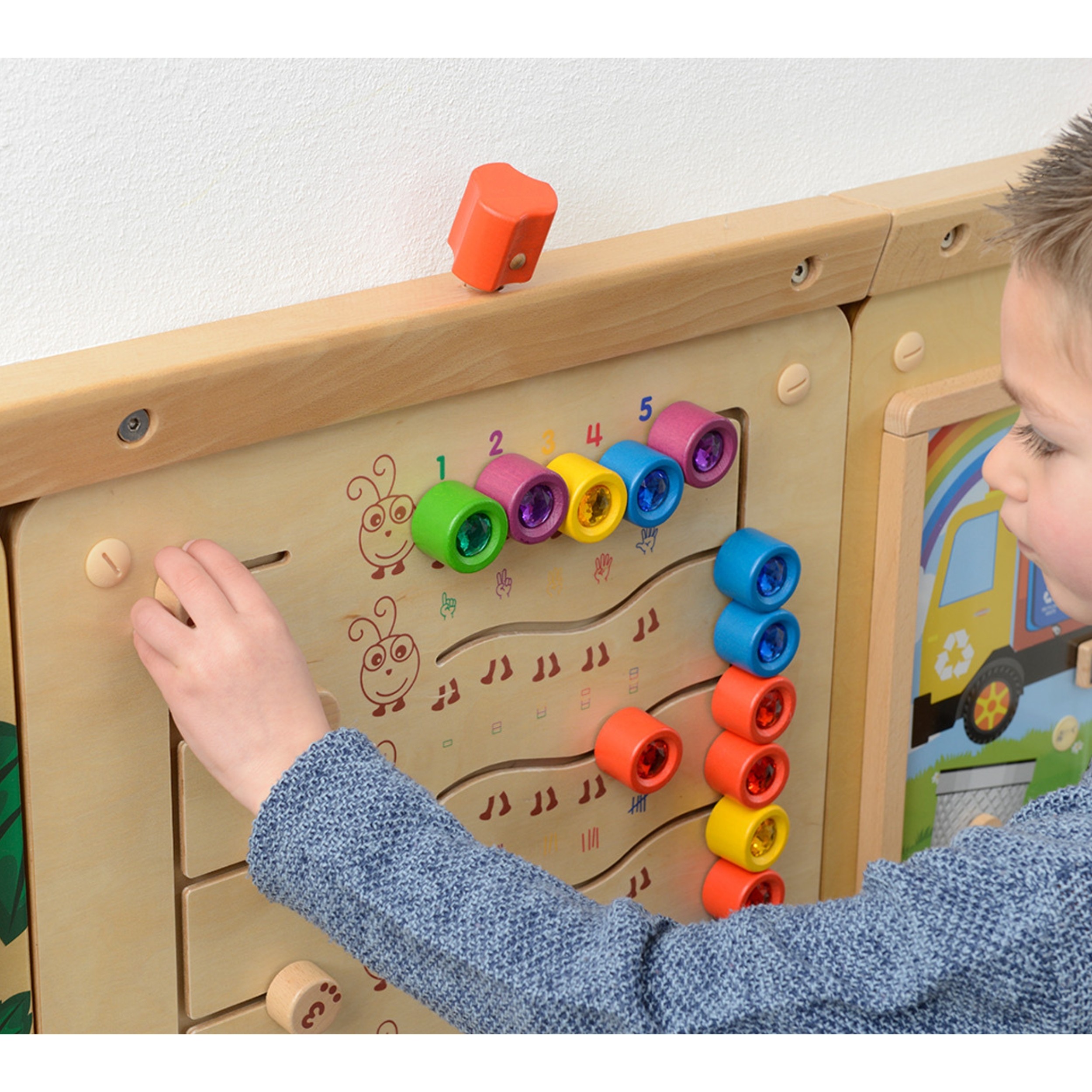 Vzdelávacia tabuľa zobrazuje 5 farebných húseníc a obsahuje 15 dielikov v tvare diamantu v 5 farbách, umiestnených na posúvačoch. Deti ich môžu posúvať, ale nie odstraňovať. Tabuľa zobrazuje 5 náhrad za čísla od 1 do 5 (číslice, prsty, čiary, bloky, bodky). Na ľavej strane sú posuvníky na nastavenie výziev. Deti sa môžu voľne hrať alebo sa pomocou tabule učia počítať.