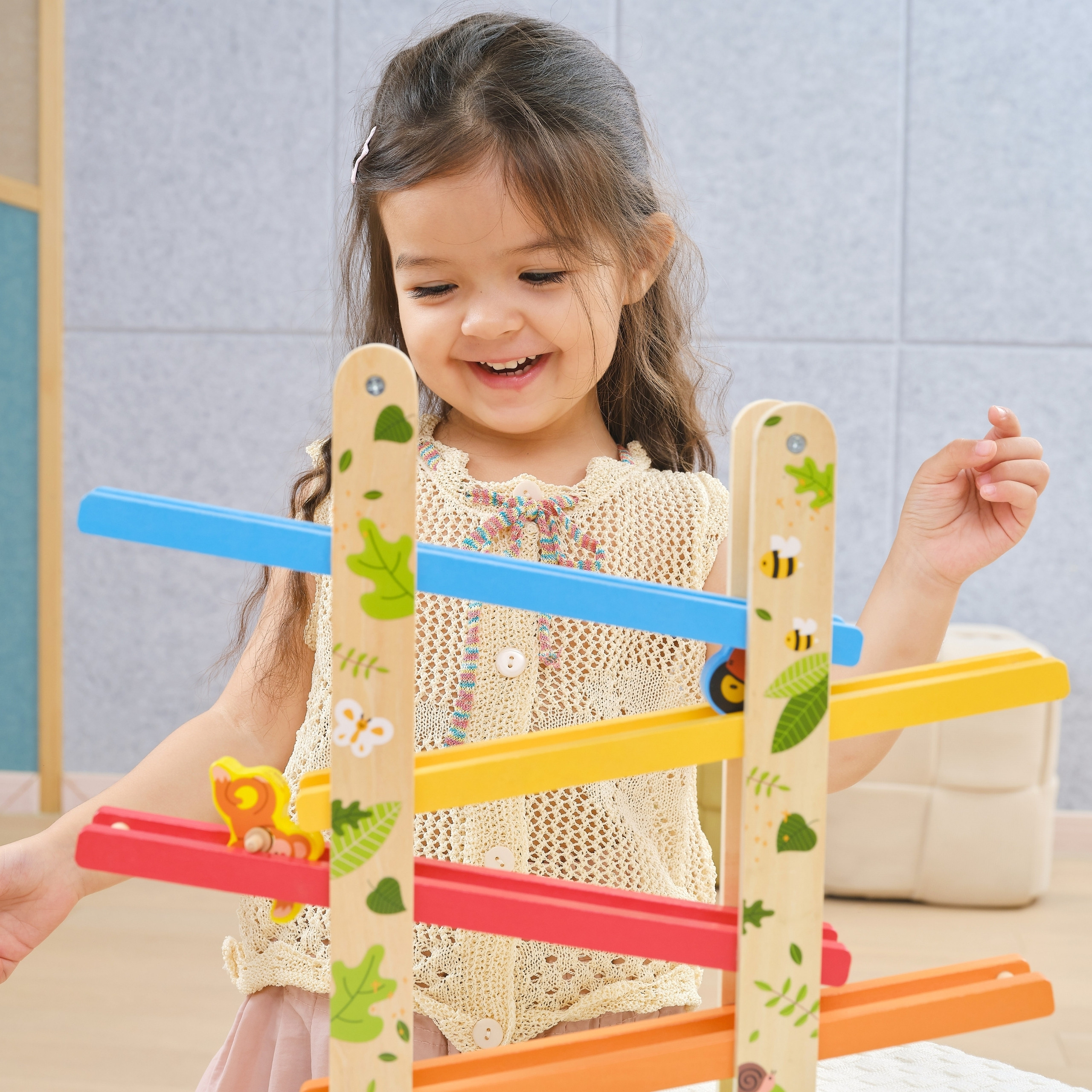 Kúzlo tejto hračky spočíva v jej opakovateľnej a predvídateľnej mágii. Pre batoľa, ktoré objavuje svet, je sledovanie zvieratka, ako samostatne prechádza dráhou a pritom sa krúti, takmer hypnotickým zážitkom. Tento jednoduchý a uspokojivý cyklus – "položím zvieratko hore, ono sa skotúľa a zatočí dolu" – je dokonalou lekciou o príčine a následku a základných fyzikálnych zákonoch, ktorá buduje v dieťati sebavedomie a základné chápanie fungovania sveta.