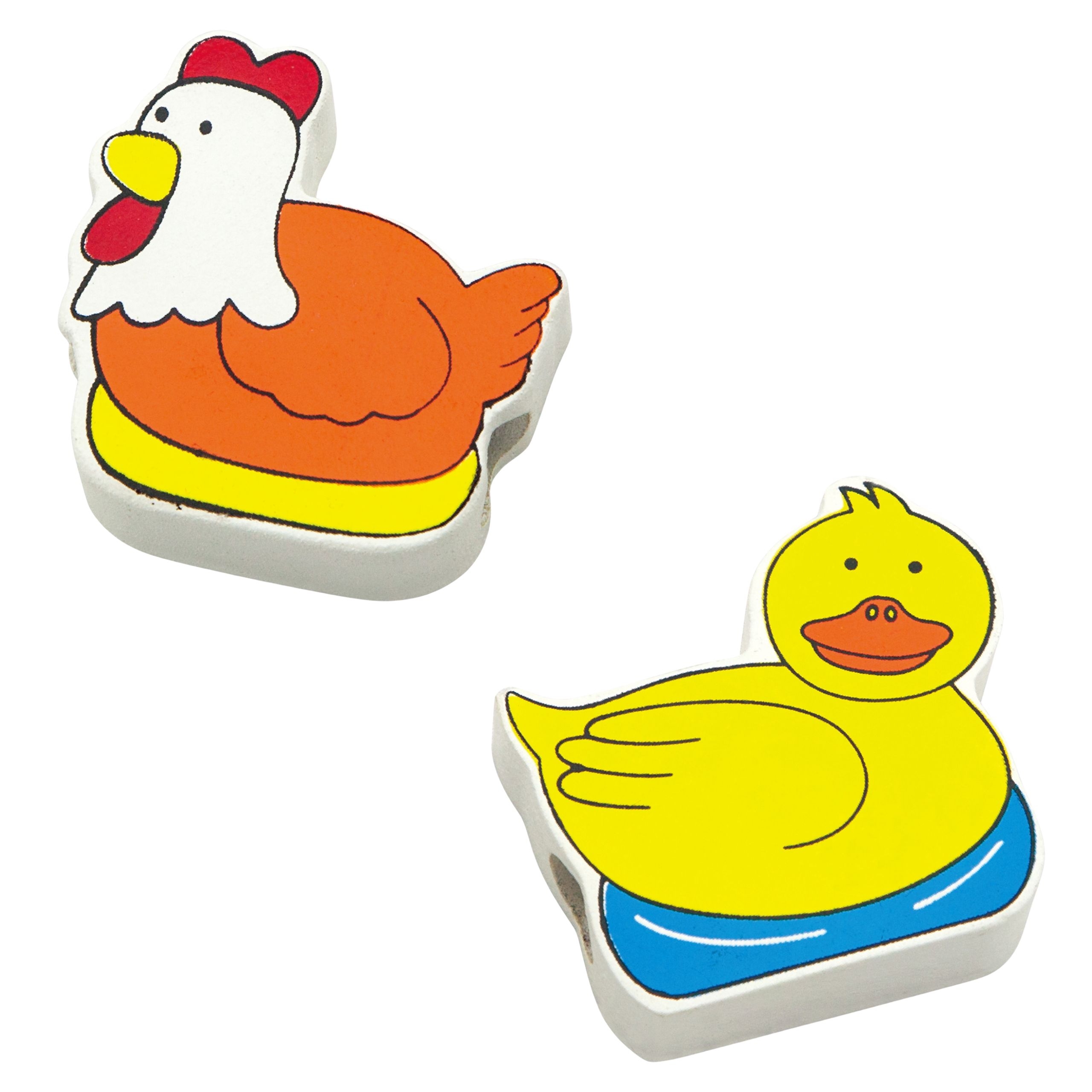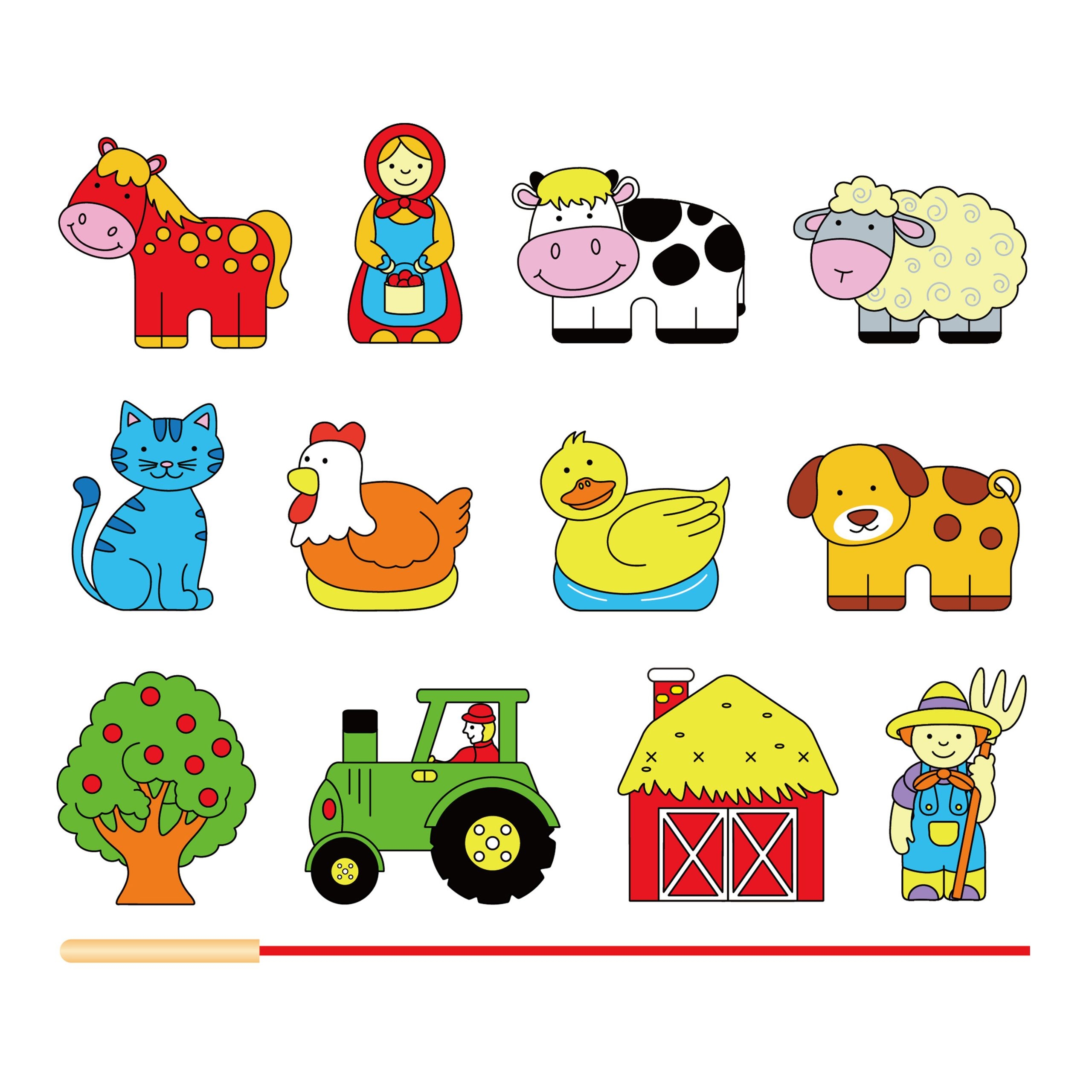 - Figúrky: krava, káčatká, mačka, líška, psík, kôň, ovečka, farmár s manželkou, traktor, stodola, jabloň