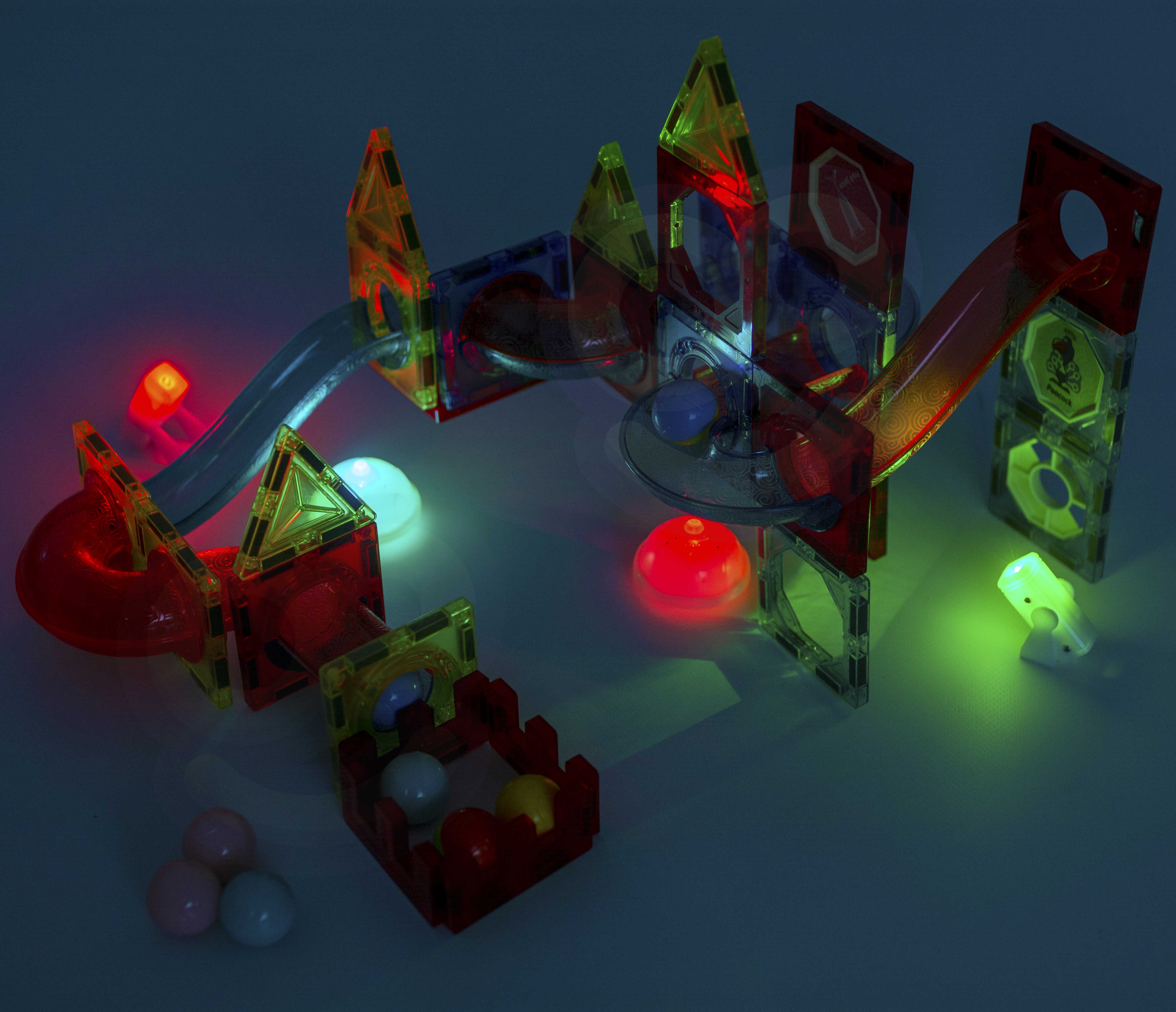 Magnetické bloky od spoločnosti WOOPIE. Skladačky sa medzi sebou veľmi ľahko spájajú, so sklíčkami môžete vytvárať nádherné štruktúry, napríklad dráhu, po ktorej sa pohybuje gulička. Dráhu je možné nasvietiť priloženou baterkou, aby bola ešte pôsobivejšia a dieťa potom môže pozorovať, ako sa svetlo pohybuje, čím sa bude rozvíjať jeho vnímanie.