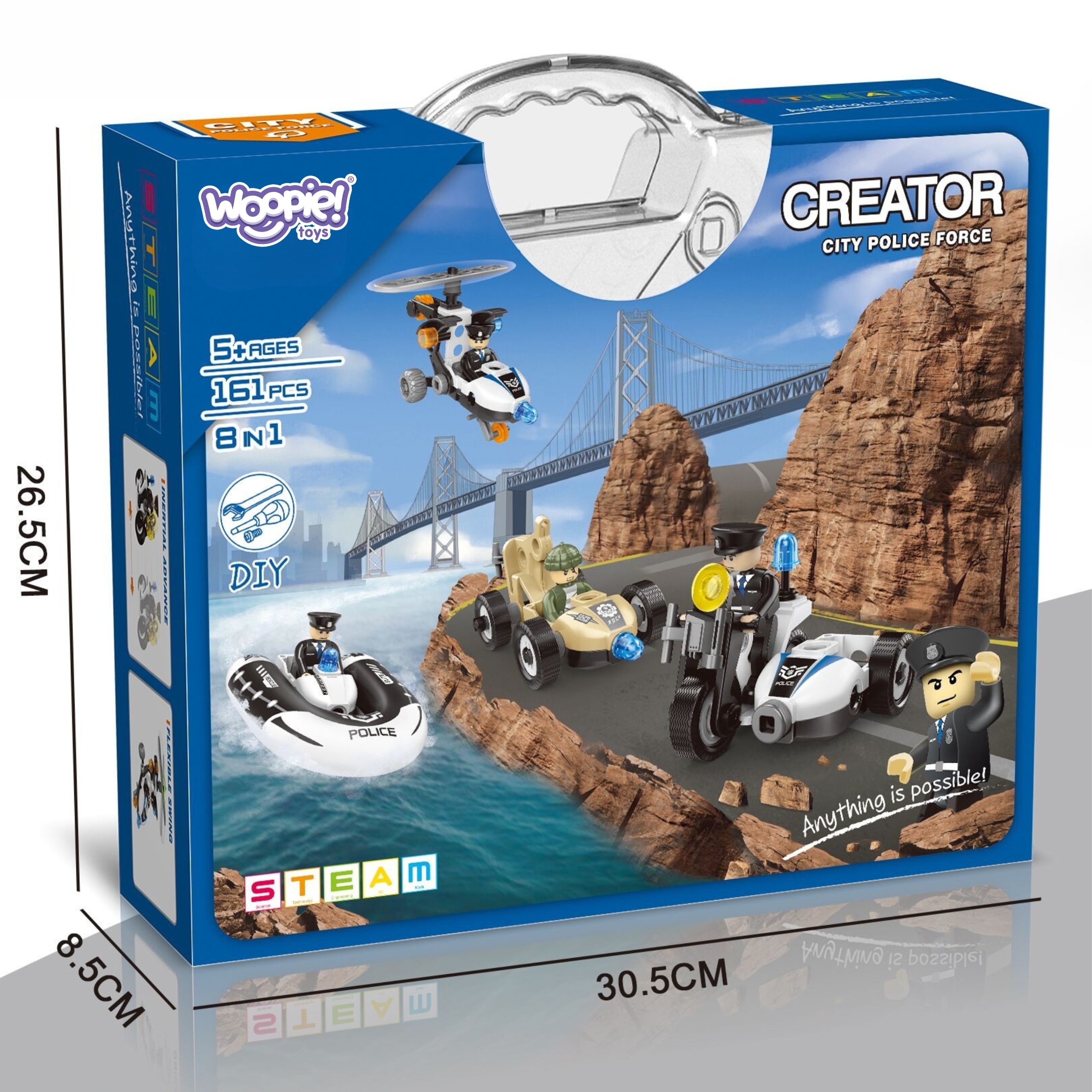 Staňte sa veliteľom špeciálnej jednotky so Stavebnicou Polícia 8v1 z radu Creator od značky WOOPIE! Tento úžasný kreatívny a edukačný set umožní vášmu malému konštruktérovi vžiť sa do roly odvážneho policajta a postaviť si až 8 rôznych policajných vozidiel – od rýchlej motorky na prenasledovanie, cez robustné terénne auto až po hliadkovací čln na vodné misie.