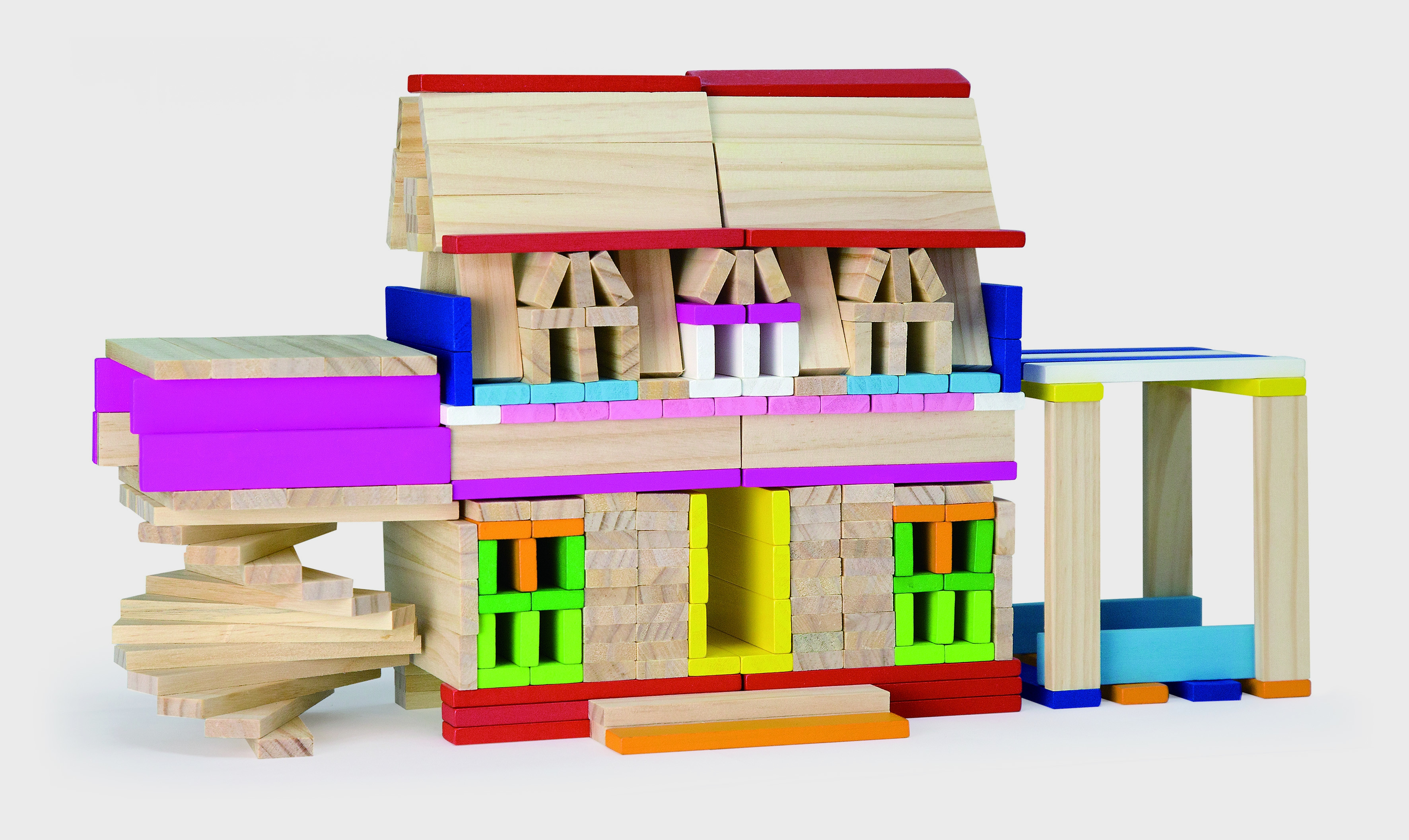 Drevená stavebnica obsahuje 250 dielov skladačiek a brožúru so vzormi stavieb. Celok je vyrobený z lakovaných drevín, maľovaný prírodnými farbami.