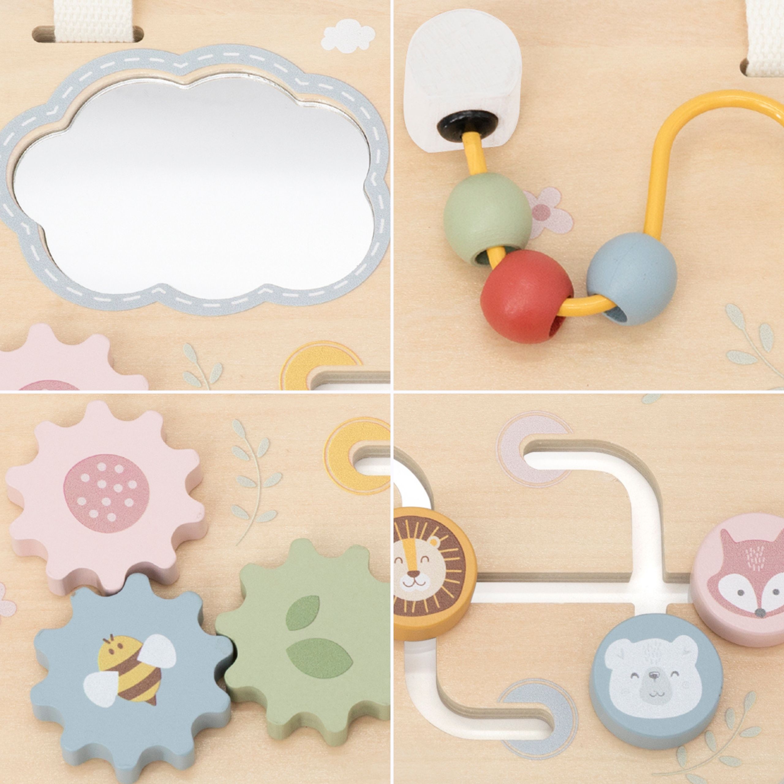To, čo robí túto tabuľu výnimočnou, sú 4 bavlnené popruhy so suchým zipsom. Vďaka nim hračku jednoducho a bezpečne pripevníte na rám postieľky alebo madlo kočíka. Dieťatko tak môže v sede alebo v ľahu skúmať svoj obraz v zrkadle, točiť ozubenými kolieskami alebo posúvať koráliky, zatiaľ čo vy si vychutnáte chvíľku pokoja.