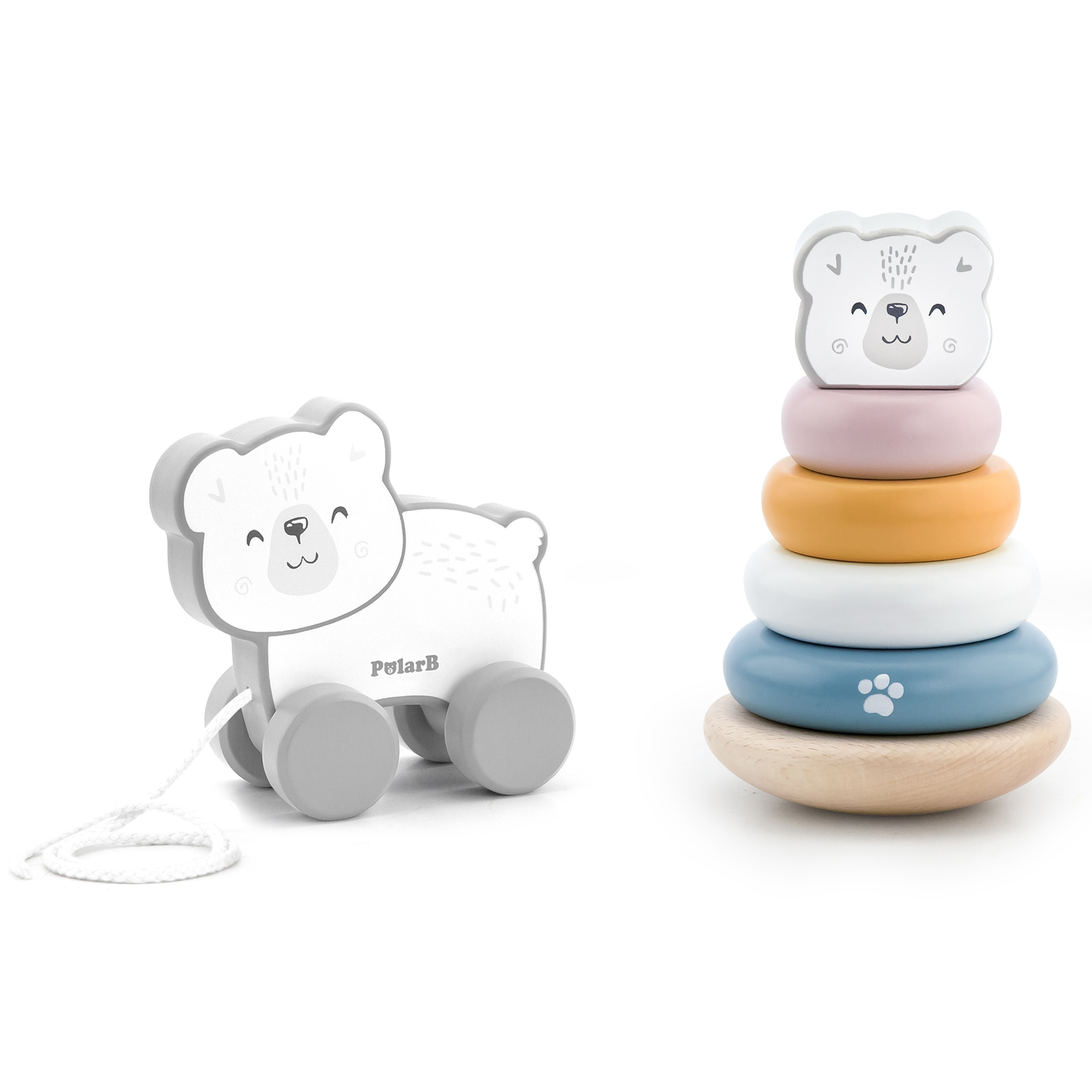 Tento set od spoločnosti Viga z kolekcie PolarB obsahuje dve pastelové drevené hračky: vzdelávaciu pyramídu Polar Bear a medvedíka na kolieskach.