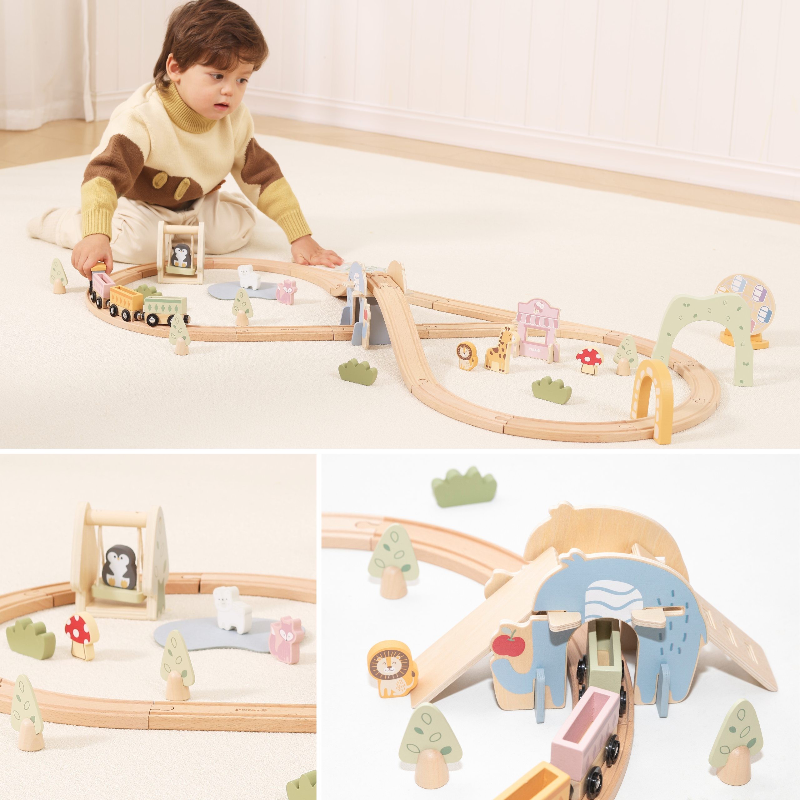 Oproti bežným železničným tratiam vyniká tento set jedinečným motívom lunaparku. Magnetický vláčik môže prevážať roztomilé zvieratká (leva, tučniaka či žirafu) cez drevené mosty, tajuplné tunely až k bráne s ruským kolesom alebo na hojdačku. Vymýšľanie dobrodružstiev v zábavnom parku je fantastickým tréningom pre rolové hry, ktoré rapídne rozširujú detskú slovnú zásobu, empatiu a komunikačné schopnosti. Jemné pastelové farby a odolné drevené spracovanie z nej navyše robia hračku, ktorá vydrží generácie.