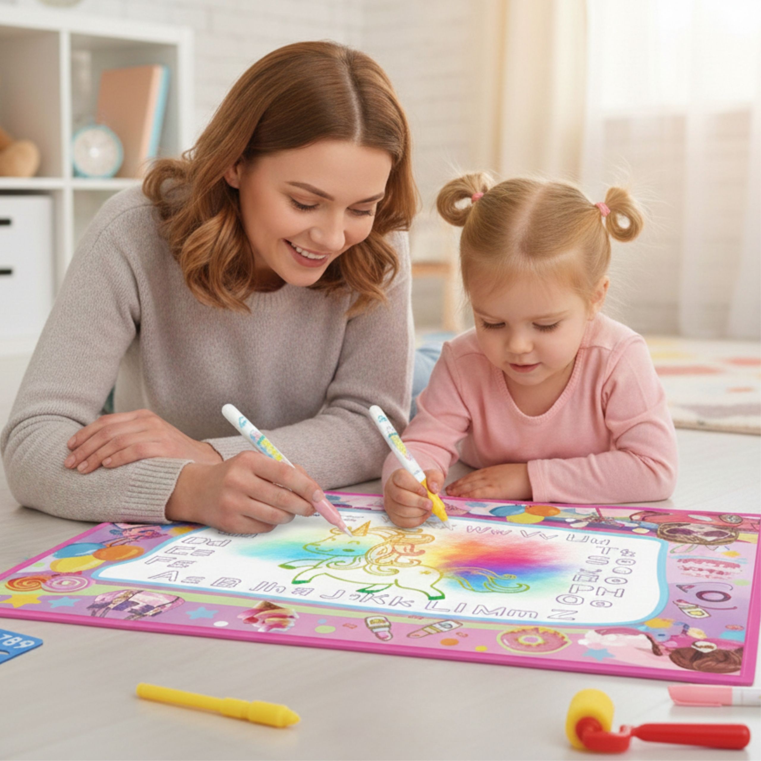 Zapáľte fantáziu svojho dieťaťa s multifunkčnou vodnou podložkou 2 v 1 od Woopie! Táto jedinečná kresliaca podložka kombinuje maľovanie vodou a kreslenie UV svetlom. Po niekoľkých minútach kresby postupne miznú, čo dáva vášmu dieťaťu možnosť tvoriť nekonečné množstvo nových majstrovských diel. Rozprávkový dievčenský motív plný balónov, jednorožcov, hradov a hviezd prenesie vaše dieťa do magického sveta kreatívnej hry. Stačí len trochu vody na vytvorenie farebných majstrovských diel – bez atramentu, bez neporiadku a bez rizika poškodenia. Ideálne na samostatnú hru alebo so súrodencami, kamarátmi či rodičmi. Podložka zlepšuje manuálnu zručnosť a koordináciu ruka-oko a je skvelým spôsobom učenia sa hrou. Môže sa používať doma aj na záhrade.