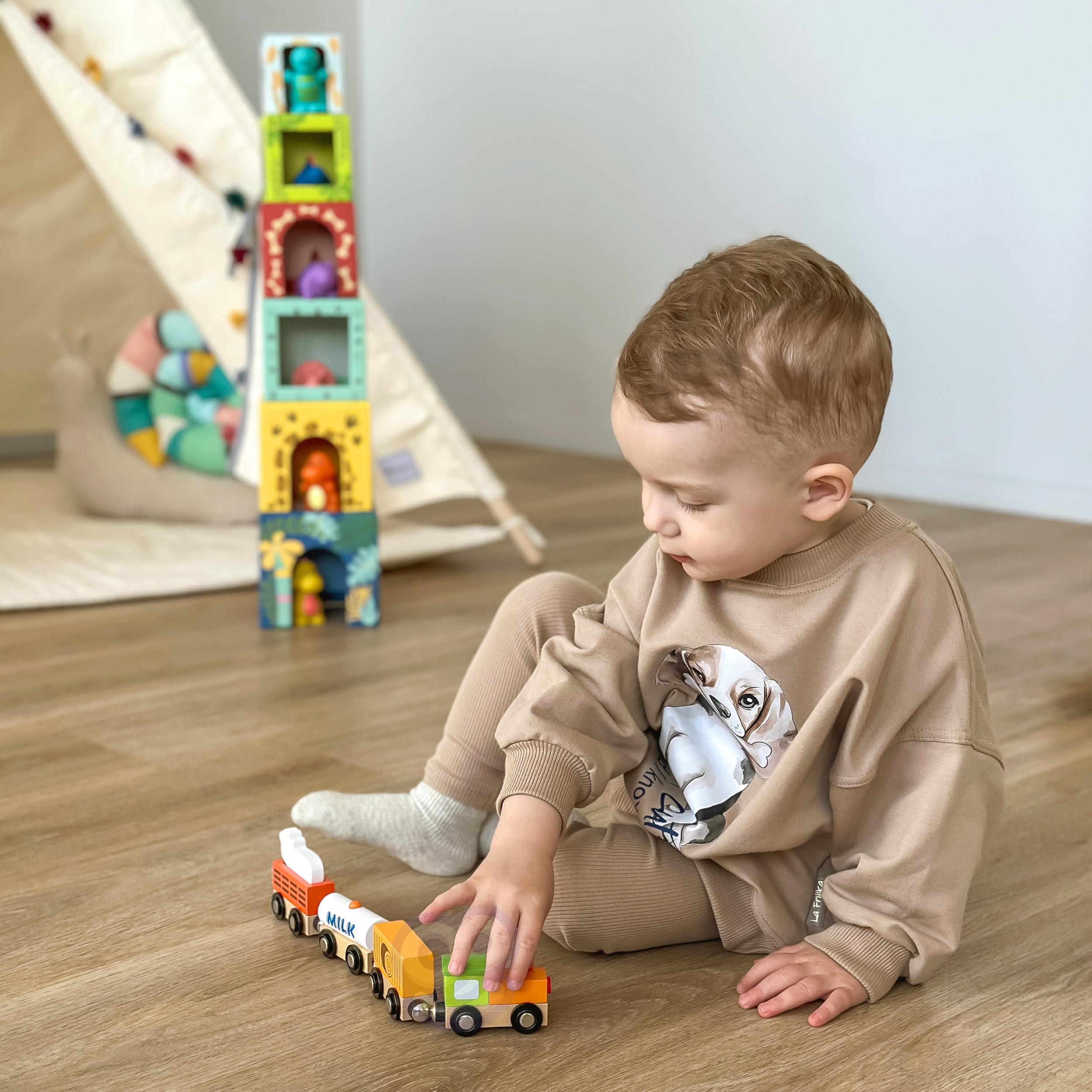 Drevený farma vláčik od spoločnosti Viga Toys pozostávajúci z 3 vagónov spojených magnetmi k vláčiku. Sada môže byť použitá ako samostatná hračka, alebo ako doplnok k súprave, ďalším sadám alebo blokom.