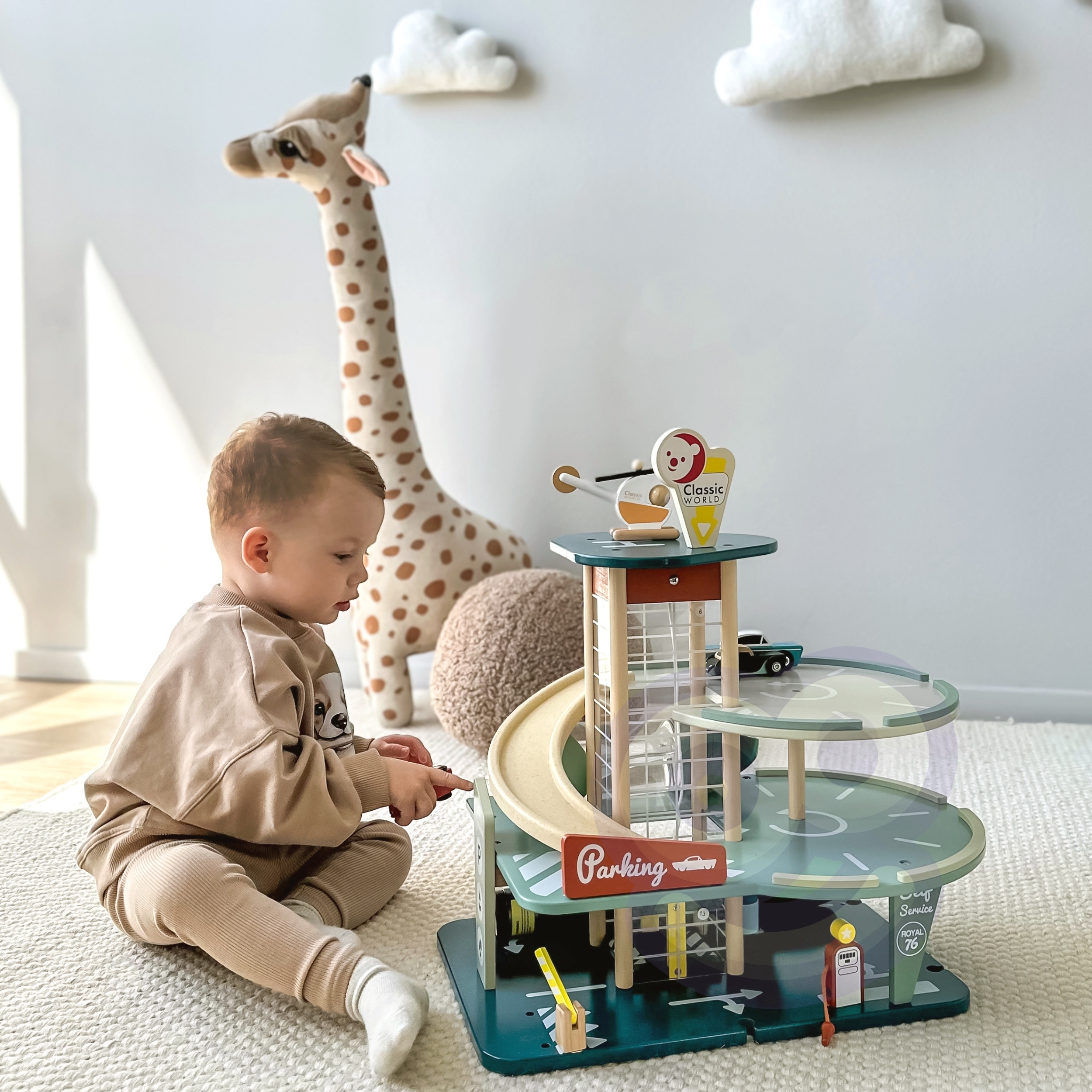 Garáž značky CLASSIC WORLD, inšpirovaná 50. rokmi, pripomína zlatú éru áut! Hračka ponúka štýlové autíčka, autoumyváreň, stojan na palivo a rampy umožňujúce prístup na parkovisko. Výťah obsluhuje všetky 3 poschodia až na vrchol plošiny s helikoptérou. Základňa je vybavená spojmi umožňujúcimi vytvorenie dráhy. Hra s inými deťmi tiež pomáha rozvíjať sociálne zručnosti. Drevo má certifikát FSC a rampy sú vyrobené z bioplastu.