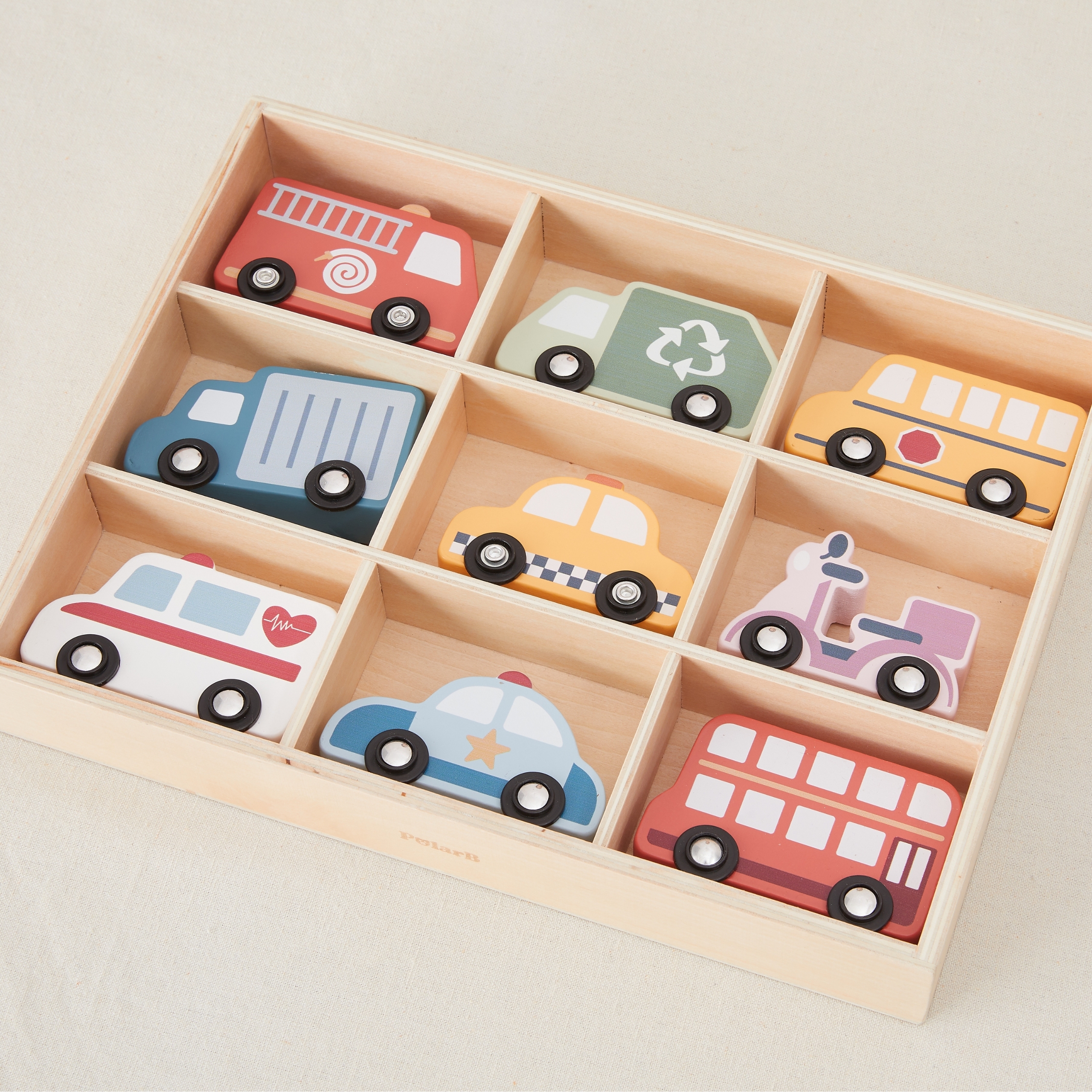 Celá flotila je prehľadne uložená v krásnej drevenej krabičke s priehradkami, ktorá slúži nielen na skladovanie, ale aj ako "garáž" a súčasť hry. Vďaka nej je sada ideálna aj na cesty – jednoducho ju zoberiete so sebou a máte o zábavu postarané.
