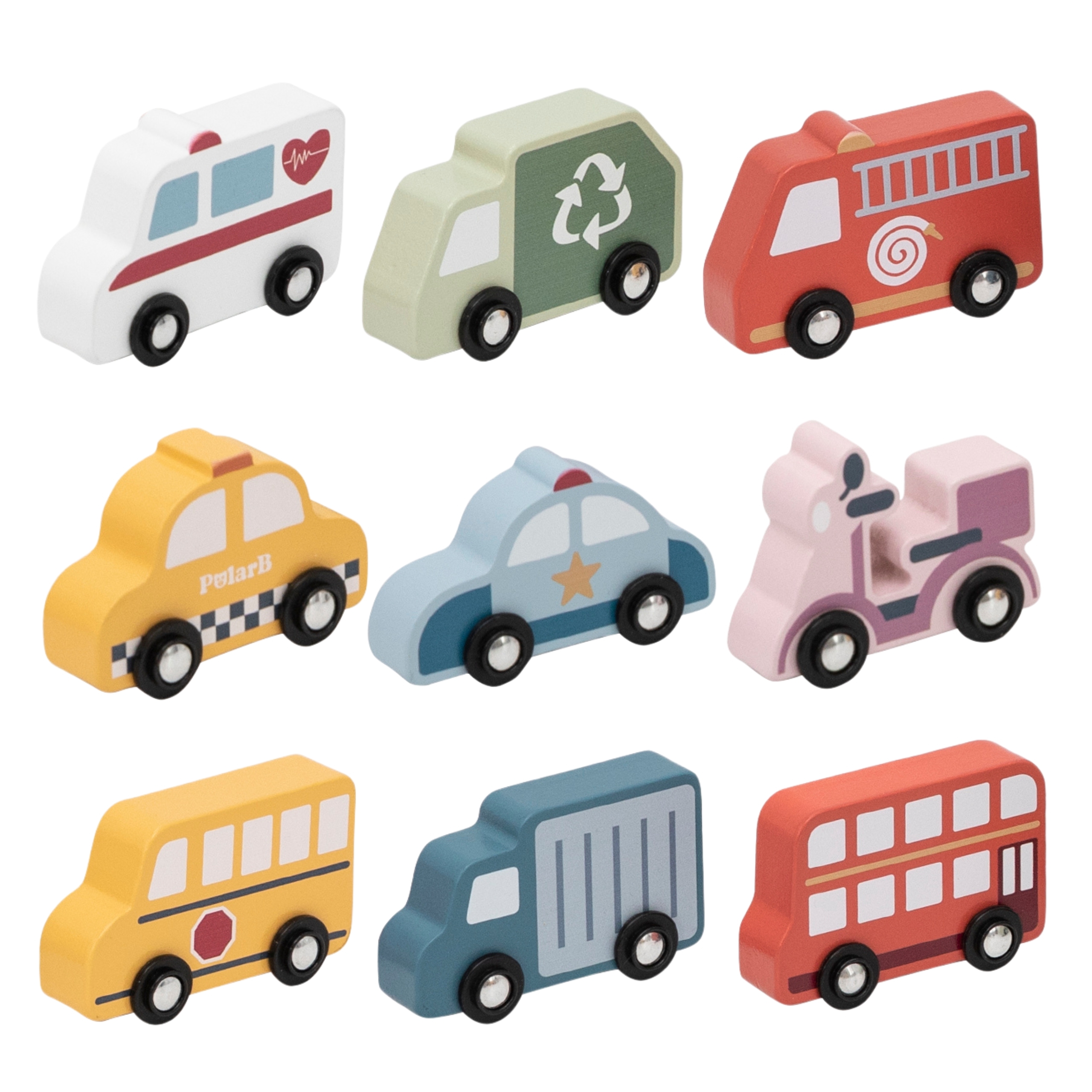 🚗 Kompletná mestská flotila: 9 rôznych vozidiel umožňuje deťom vytvárať komplexné dopravné situácie a hrať sa na rôzne profesie (hasič, policajt, záchranár, šofér...).