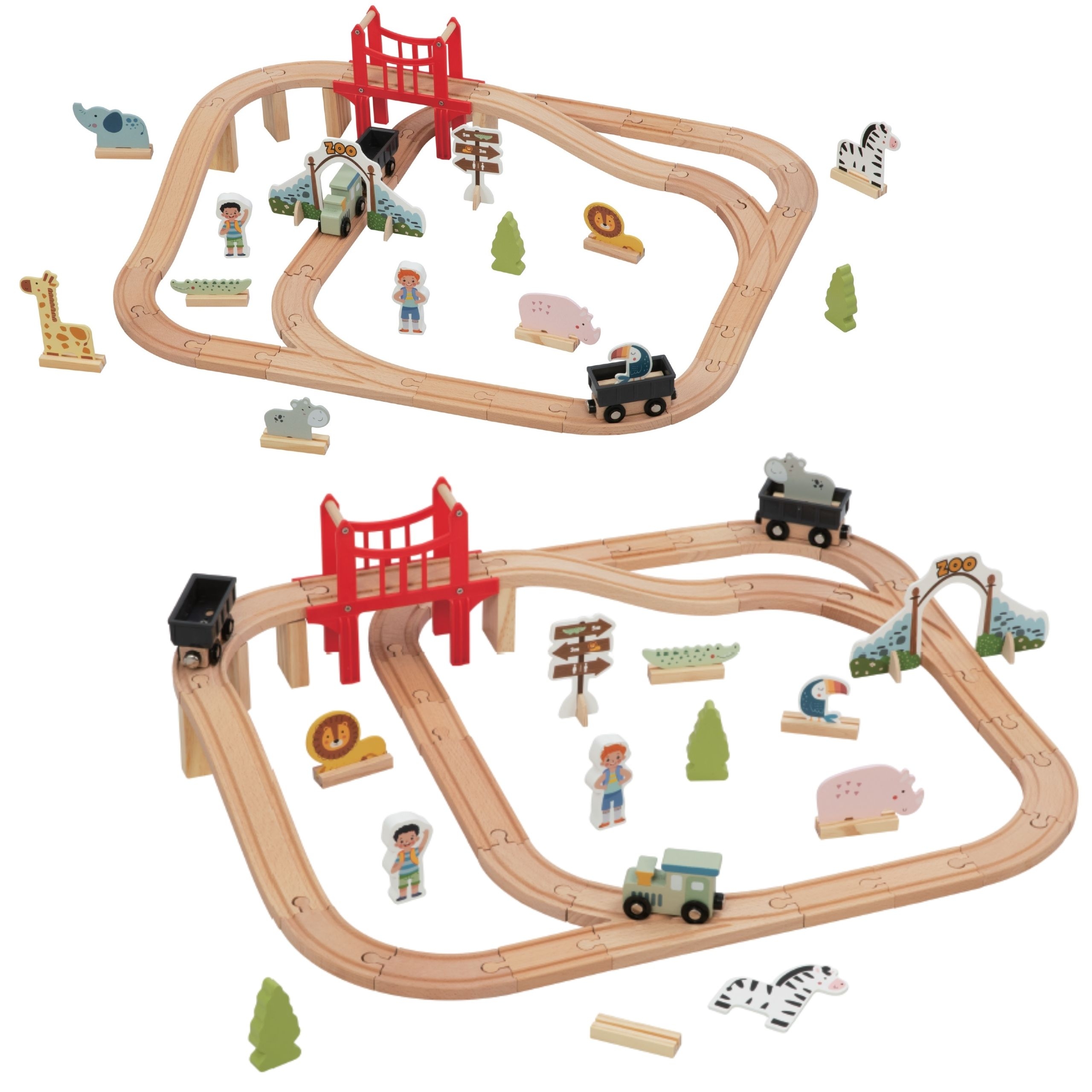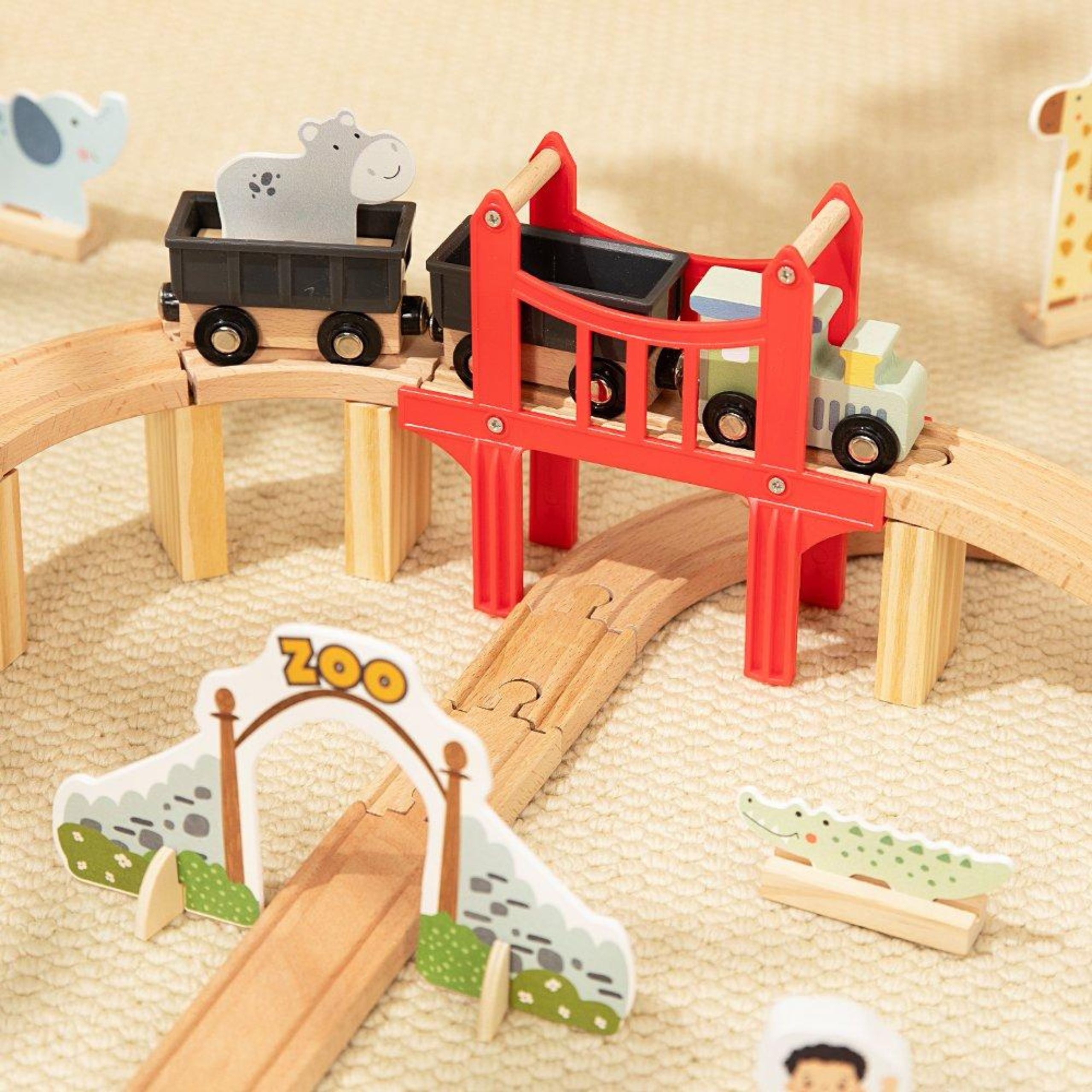 Deti si môžu samy postaviť trať, prejsť vláčikom cez červenú vstupnú bránu, prekonať vyvýšený most a navštíviť svojich obľúbených zvieracích kamarátov. V sade nájdete žirafu, slona, leva, zebru a ďalšie zvieratká. Vagóniky sa spájajú pomocou praktických magnetov, čo zvládnu aj malé rúčky detí od 3 rokov.