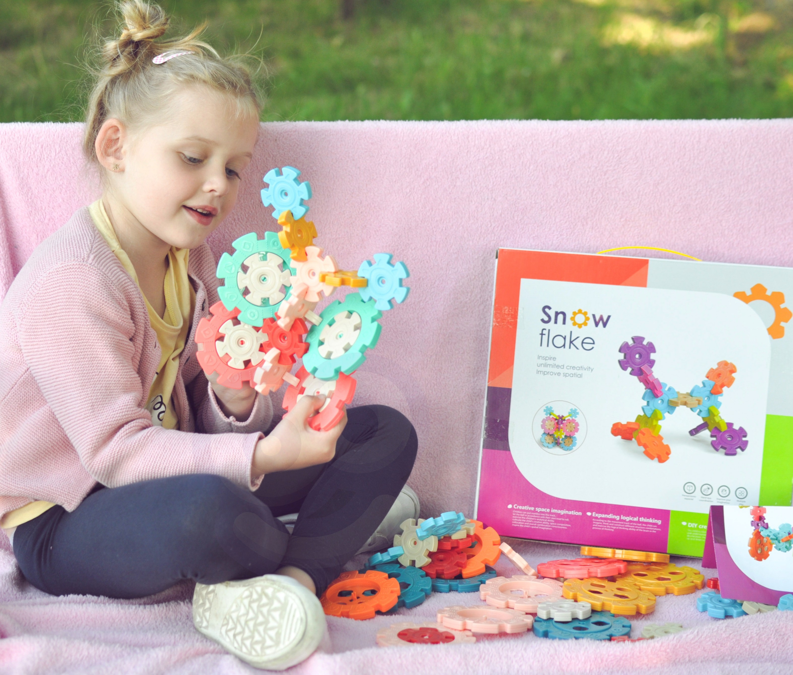 Stavebné bloky - vafle od spoločnosti WOOPIE upútajú pozornosť každého dieťaťa. Farebné prvky sú v podobe snehovej vločky. Skladačky sa medzi sebou veľmi ľahko spájajú a vzhľadom na ich konštrukciu je z nich možné vytvoriť zaujímavé trojrozmerné konštrukcie. Sada obsahuje 120 prvkov: vrátane 40 veľkých a 80 malých skladačiek. Samotné skladanie pomáha pri rozvoji logického myslenia, predstavivosti a kreativity.