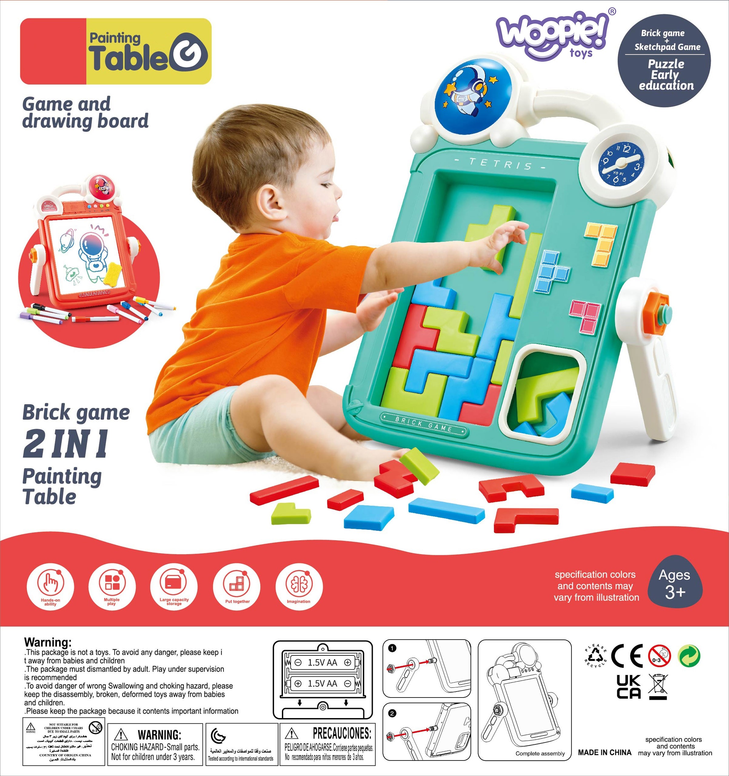 Obojstranná tabuľa na kreslenie a hra Tetris od spoločnosti Woopie. Kresliaca tabuľka obsahuje 8 fixiek, hubku a 36 zmazateľných kariet na vyfarbovanie alebo písanie. Kreslenie spríjemnia 4 hudobné tlačidlá. Druhú stranu tabule tvoria zábavné puzzle - tetris, ktoré zaujme každé dieťa a rozvinie jeho fantáziu a tvorivé myslenie. Farebné bloky je možné skladať vertikálne alebo horizontálne a vytvárať tak zaujímavé postavy a obrázky alebo samostatné 3D budovy.