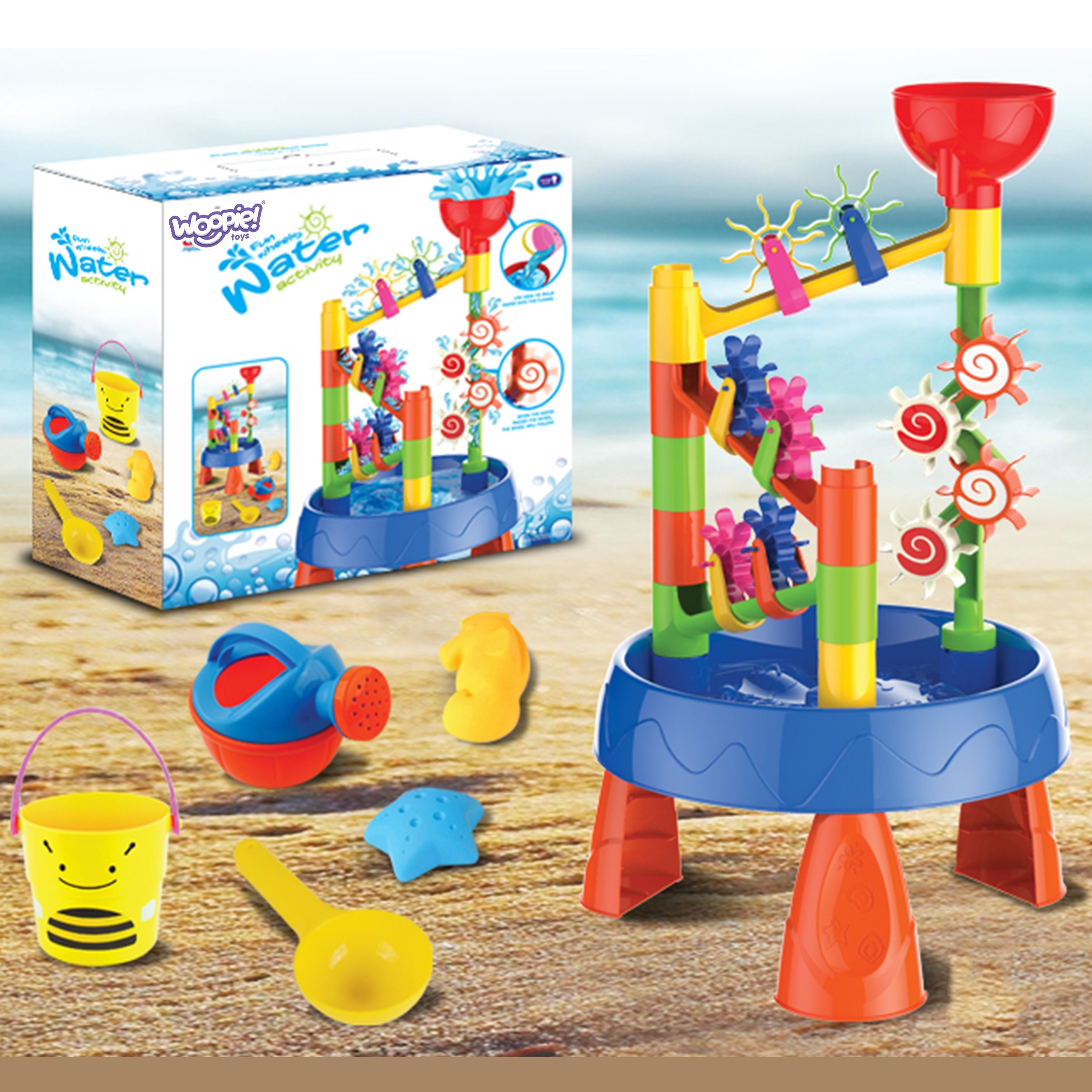 Vodný stôl a pieskovisko 2 v 1 od spoločnosti WOOPIE je dokonalá hračka na hru s vodou a pieskom. Sada obsahuje 5 doplnkov: formičky, krhlu, vedro, naberačku na vodu. Na stolíku sú umiestnené interaktívne mlynčeky, ktoré sa po naliatí vody do lievika otáčajú. Ideálne na hranie doma, na pláži alebo na pieskovisku.