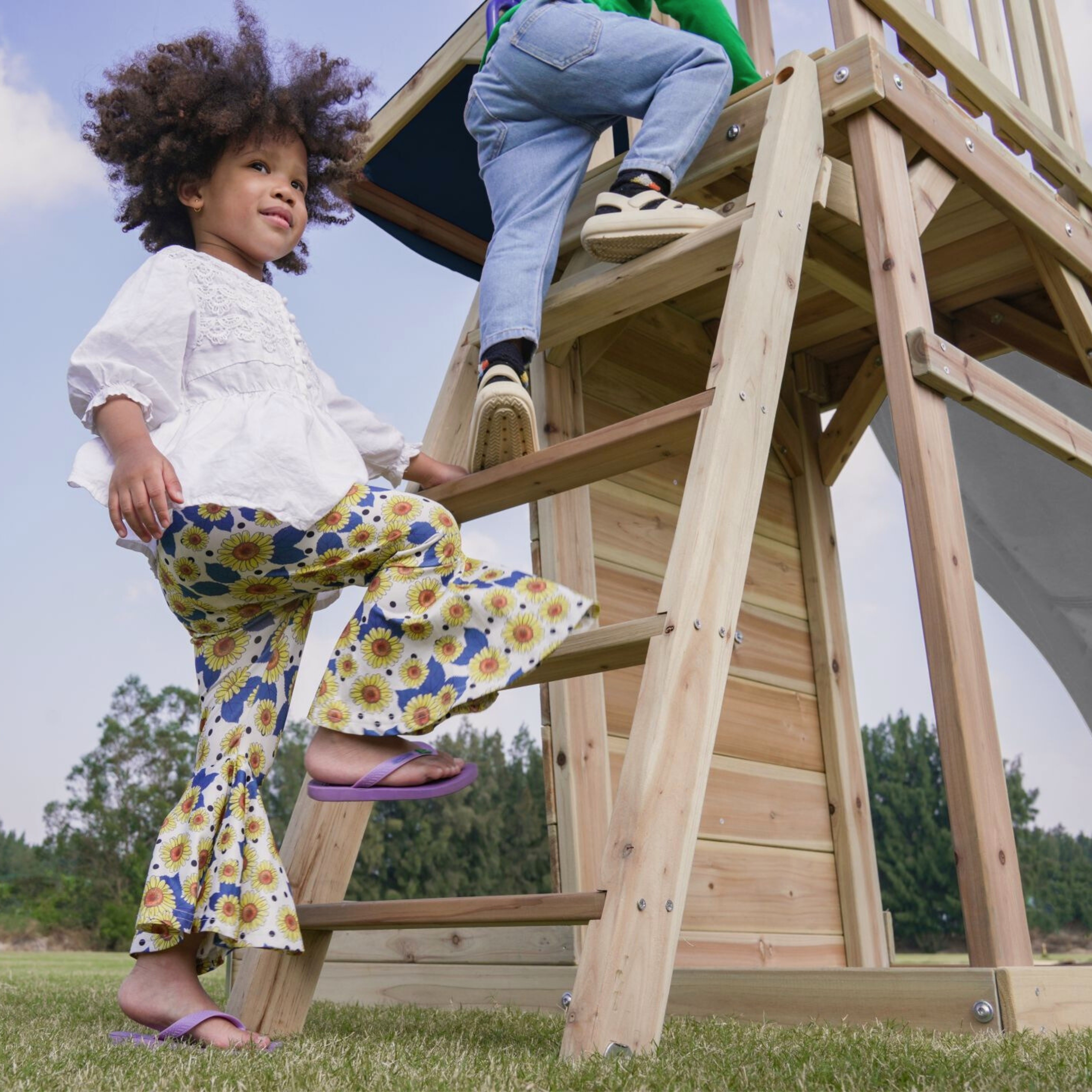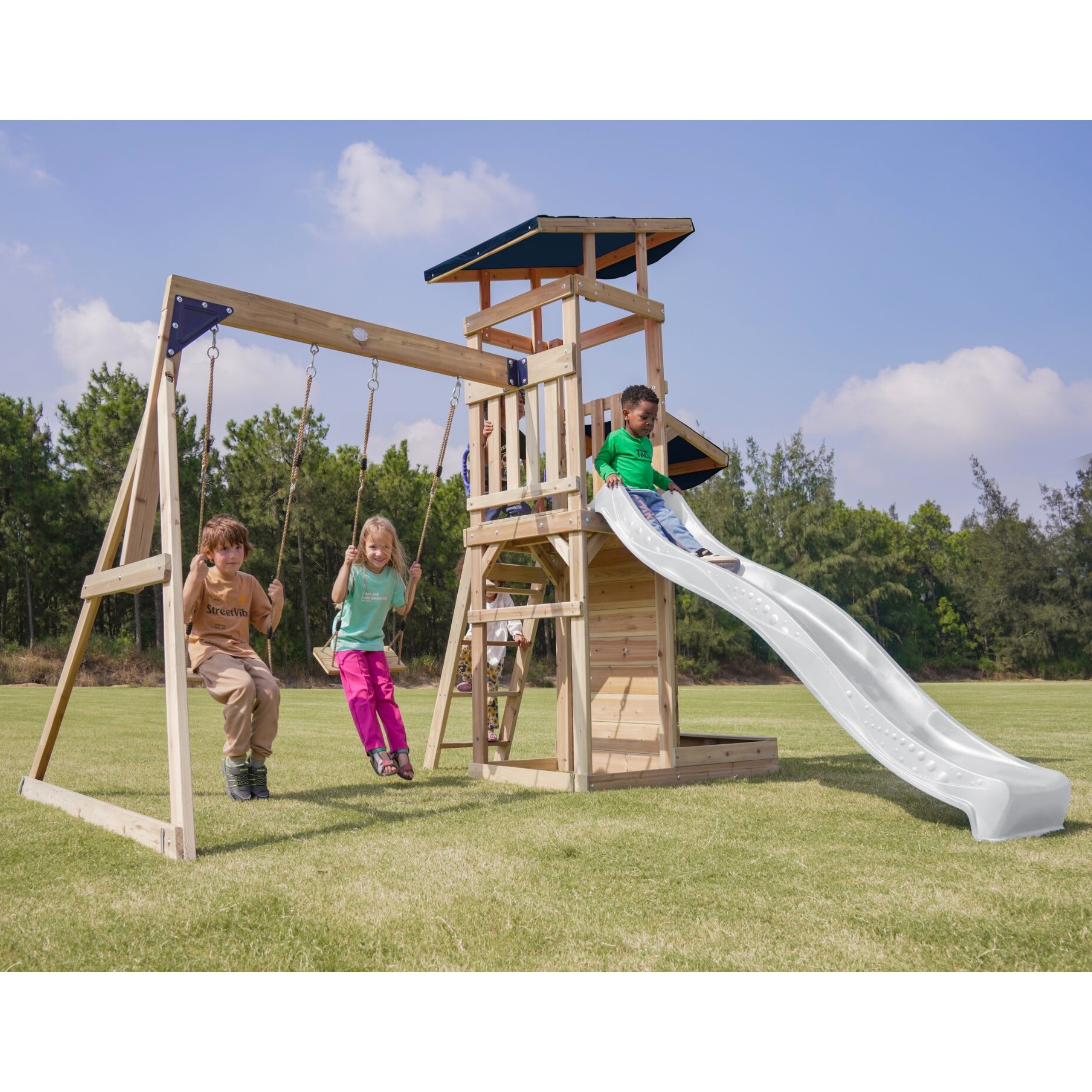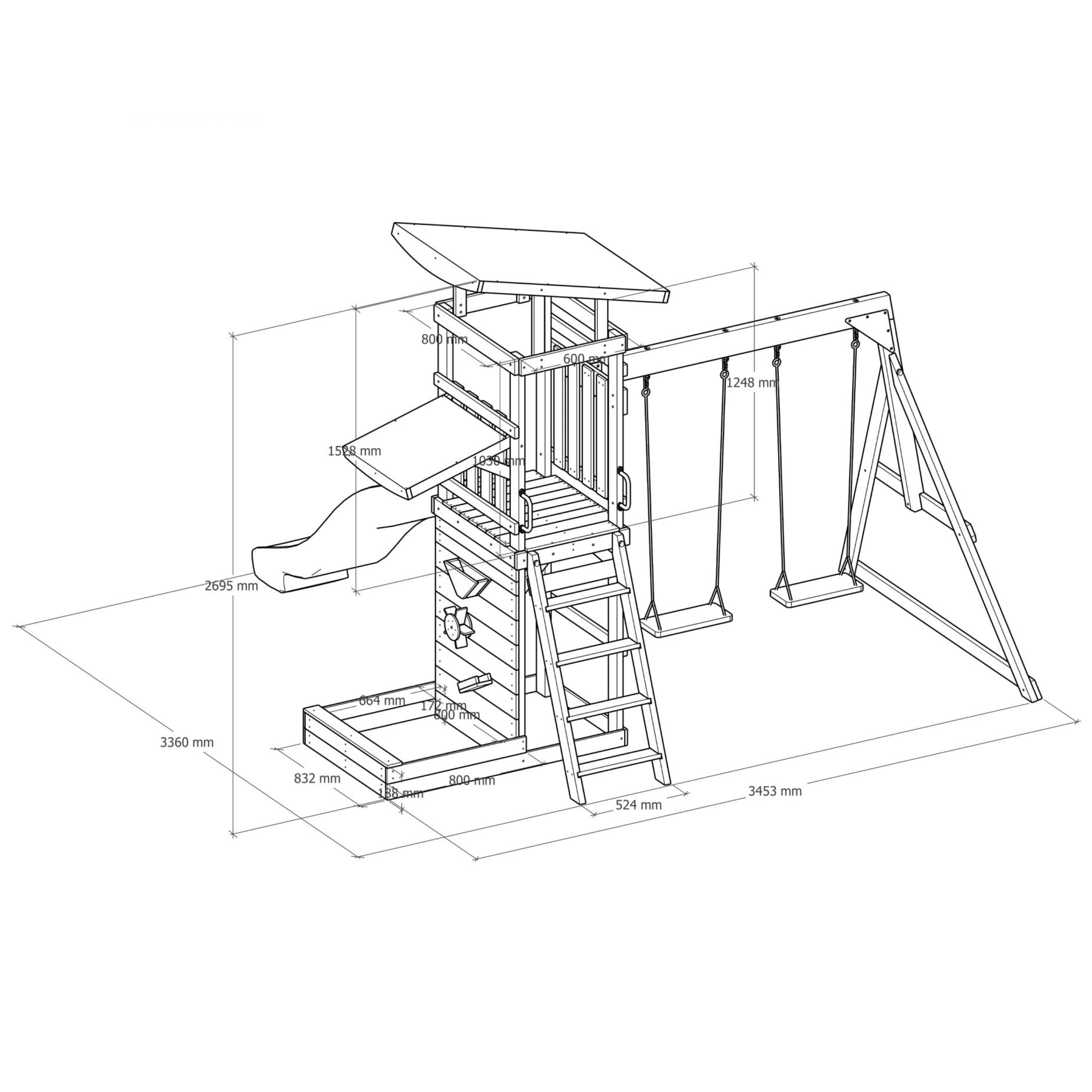 ✔ Vďaka rôznorodosti prvkov – vyhliadková veža, dlhá šmykľavka, dvojhojdačka a pieskovisko – môžu deti rozvíjať svoju kreativitu, silu a motorickú koordináciu na jednom mieste!